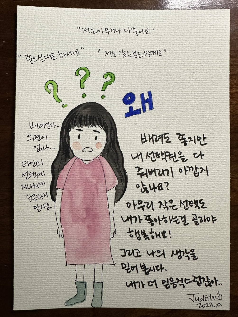 글쓰고 그림그리고 음악을 연주하고.. 아직은 펜과 물감이 좋은 사람입니다. “새벽 5시 책상앞, 쥬디스 그림일기“ 출판하였고, 언젠가 나왔으면 하는 2편을 준비중입니다.