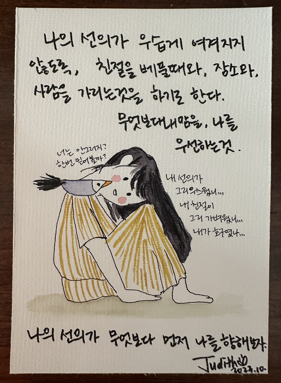 글쓰고 그림그리고 음악을 연주하고.. 아직은 펜과 물감이 좋은 사람입니다. “새벽 5시 책상앞, 쥬디스 그림일기“ 출판하였고, 언젠가 나왔으면 하는 2편을 준비중입니다.