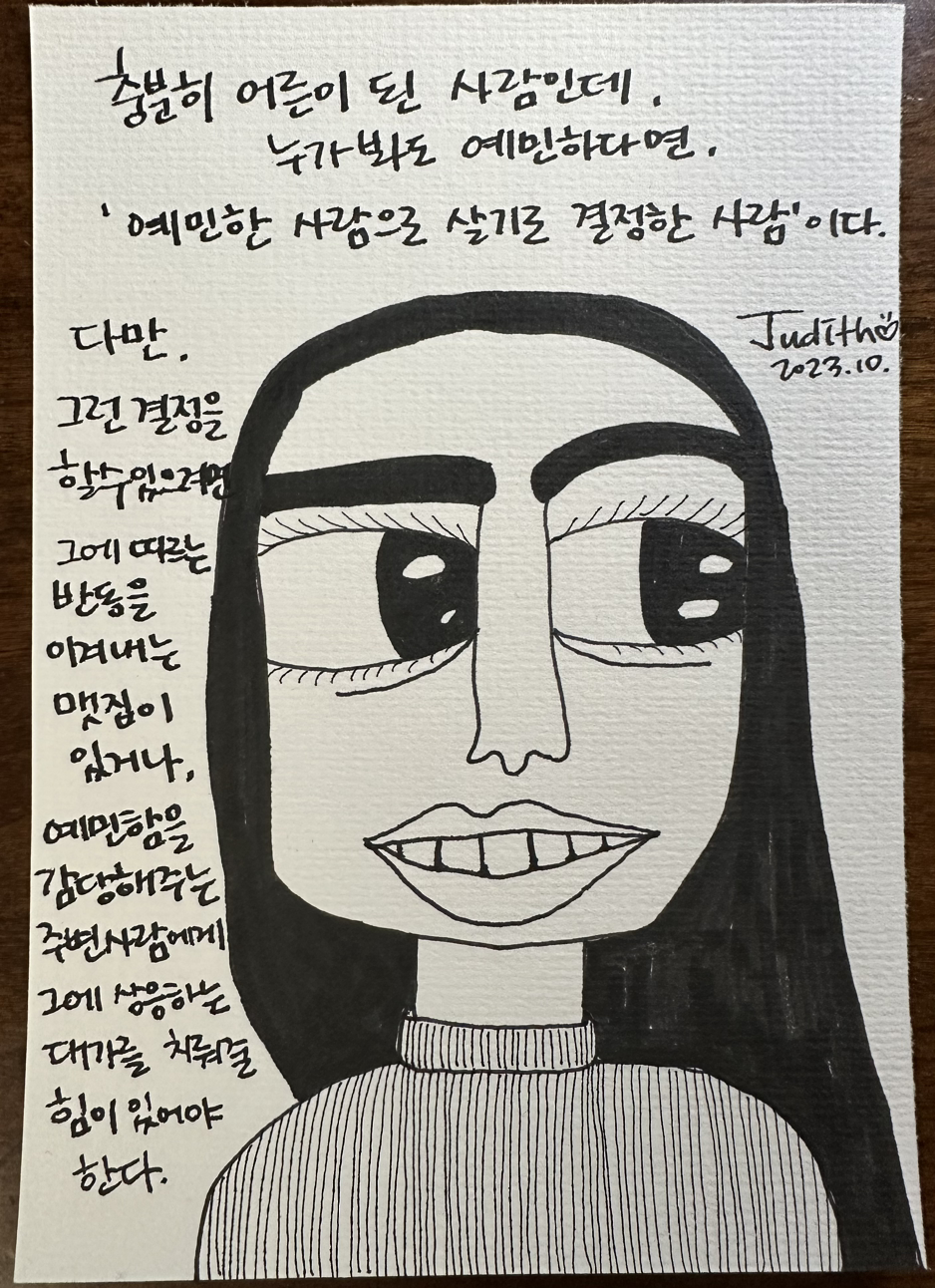 글쓰고 그림그리고 음악을 연주하고.. 아직은 펜과 물감이 좋은 사람입니다. “새벽 5시 책상앞, 쥬디스 그림일기“ 출판하였고, 언젠가 나왔으면 하는 2편을 준비중입니다.