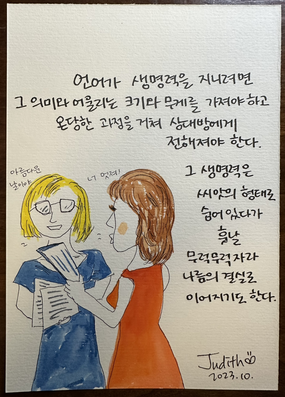 언어가 생명력을 지니려면 그 의미와 어울리는 크기와 무게를 가져야하고 온당한 과정을 거쳐 상대방에게 전해져야 한다. 그 생명력은 씨앗의 형태로 숨어있다가 훗날 무럭무럭 자라 나름의 결실로 이어지기도 한다.