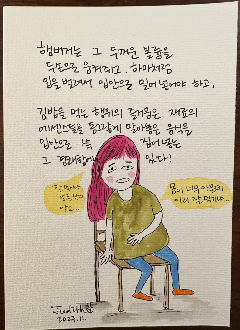 글쓰고 그림그리고 음악을 연주하고.. 아직은 펜과 물감이 좋은 사람입니다. “새벽 5시 책상앞, 쥬디스 그림일기“ 출판하였고, 언젠가 나왔으면 하는 2편을 준비중입니다.