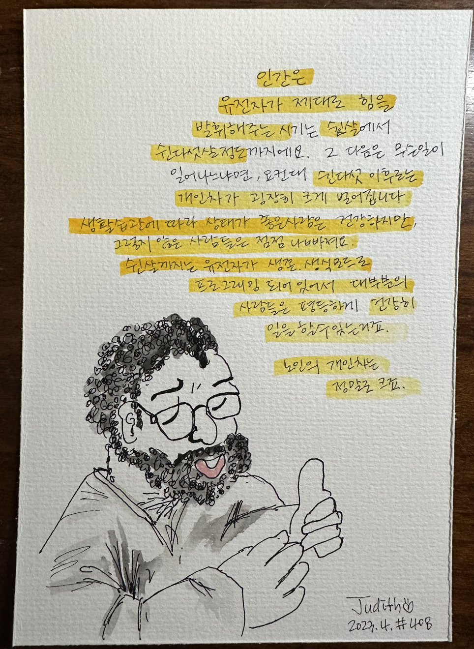 글쓰고 그림그리고 음악을 연주하고.. 아직은 펜과 물감이 좋은 사람입니다. “새벽 5시 책상앞, 쥬디스 그림일기“ 출판하였고, 언젠가 나왔으면 하는 2편을 준비중입니다.