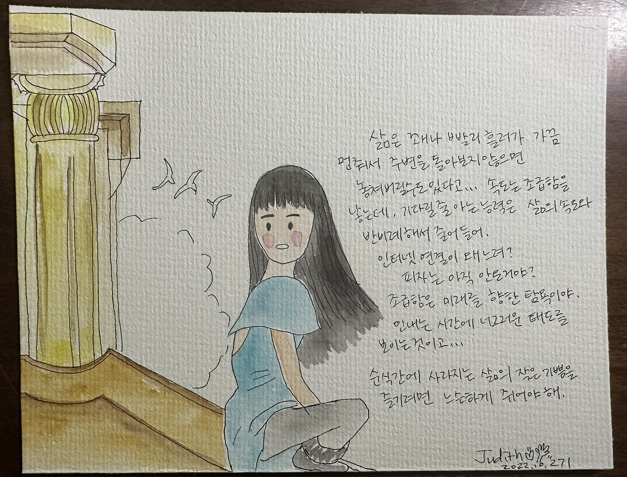 글쓰고 그림그리고 음악을 연주하고.. 아직은 펜과 물감이 좋은 사람입니다. “새벽 5시 책상앞, 쥬디스 그림일기“ 출판하였고, 언젠가 나왔으면 하는 2편을 준비중입니다.