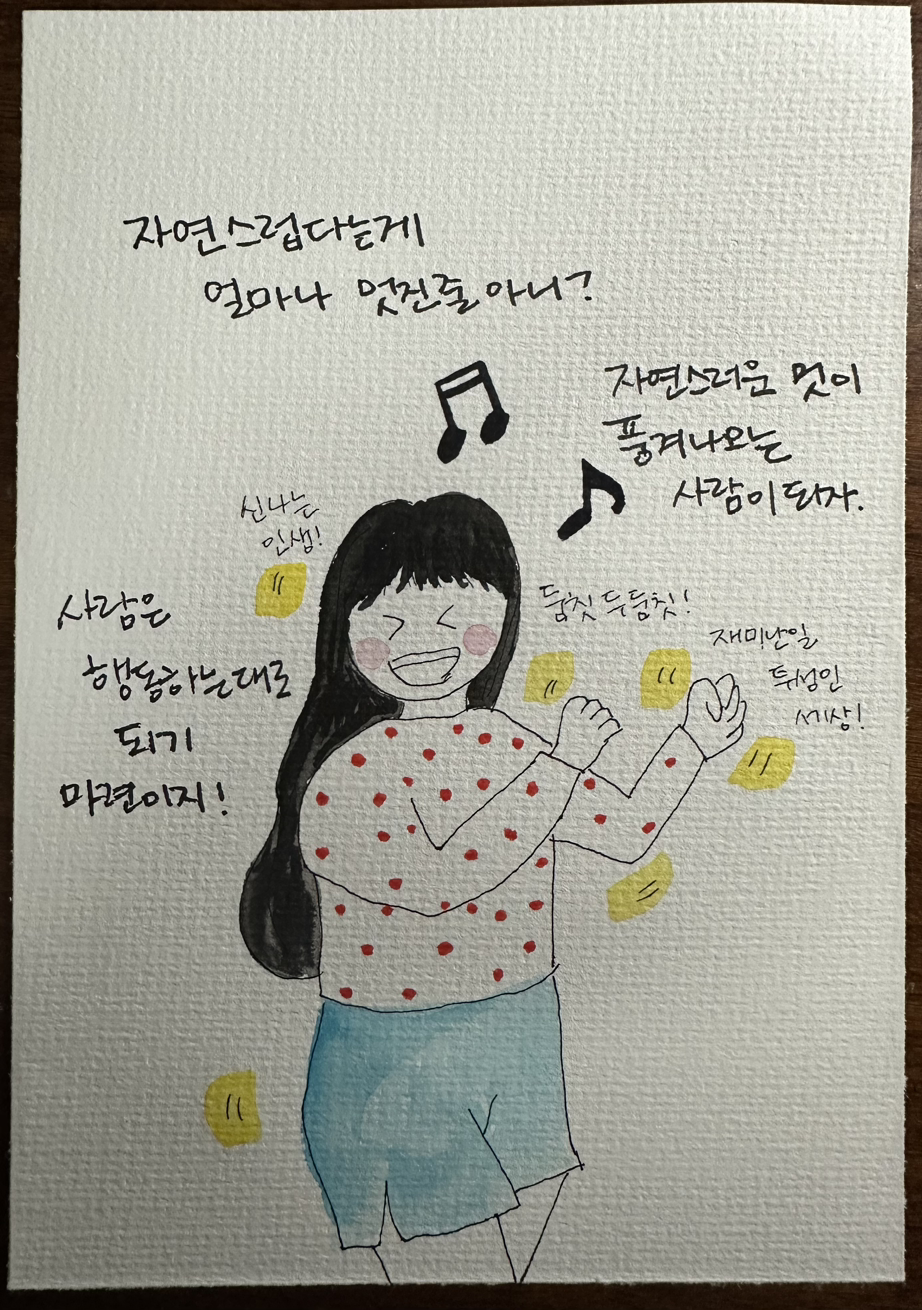 자연스럽다는게 얼마나 멋진줄 아니? 사람은 행동하는대로 되기 마련이지. 억지로 꾸미지 않는 행동, 그리고 무심결에 나오는 동작이나 말들속에서 우리가 보이지. 그 순간에 우리가 매력을 느끼지 않을까? 자연스러운 멋이 풍겨나오는 사람이 되어야겠어.