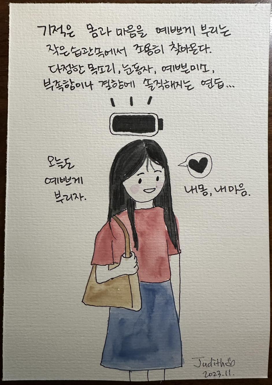 기적은 몸과 마음을 예쁘게 부리는 작은 습관속에서 조용히 찾아온다. 다정한 목소리, 눈동자, 예쁜 미소, 부족함이나 결함에 솔직해지는 연습. 오늘도 내몸, 내 마음을 예쁘게 부려보자. 기적이 찾아올지도...