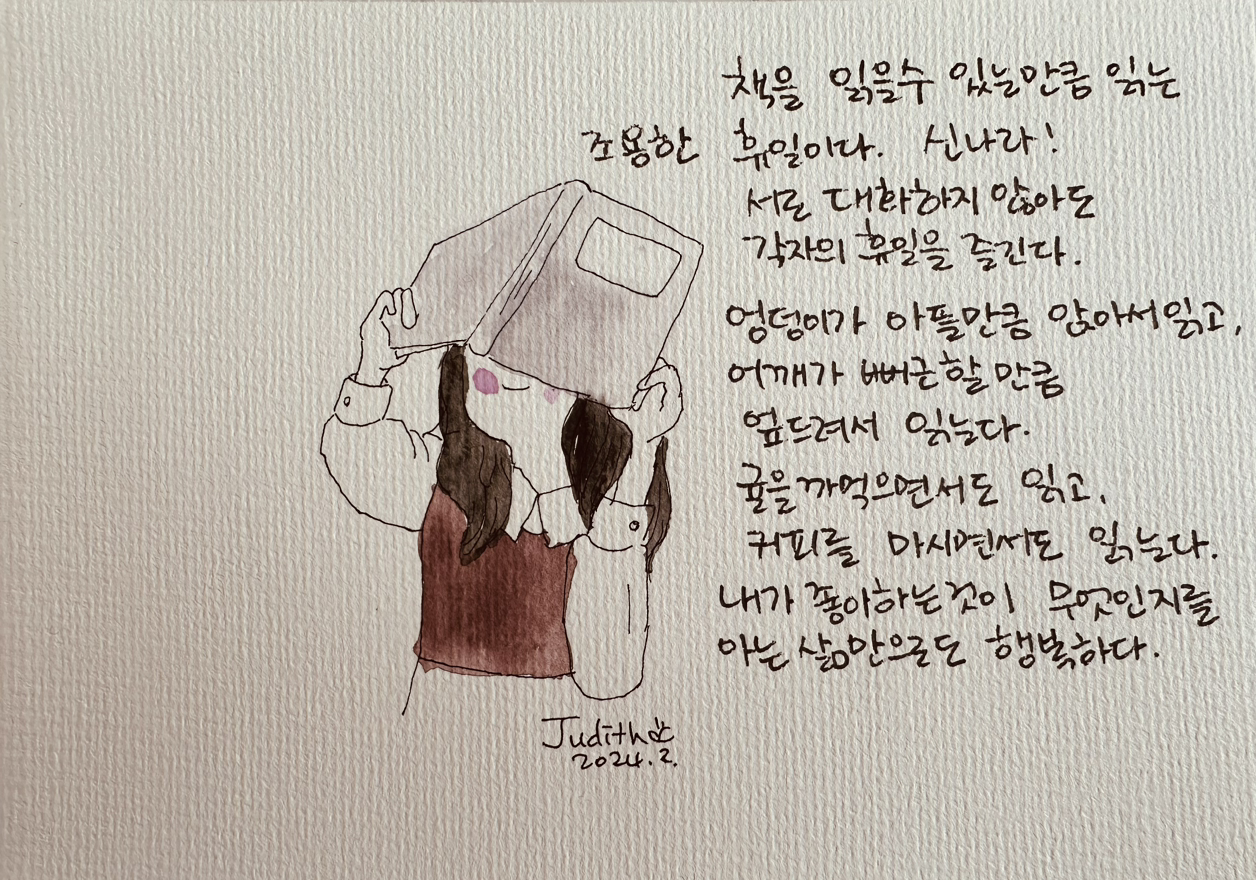 책을 읽을수 있는 만큼 읽는 조용한 휴일이다. 신나라! 서로 대화하지 않아도 각자의 휴일을 즐긴다. 엉덩이가 아플만큼 앉아서 읽고, 어깨가 뻐근할만큼 엎드려서 읽는다. 귤을 까먹으면서도 읽고, 커피를 마시면서도 읽는다. 내가 좋아하는것이 무엇인지를 아는 삶만으로도 행복하다.