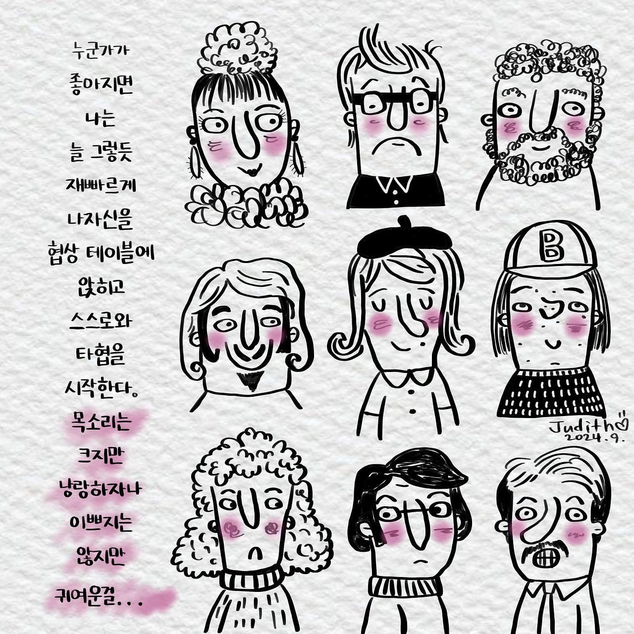 글쓰고 그림그리고 음악을 연주하고.. 아직은 펜과 물감이 좋은 사람입니다. “새벽 5시 책상앞, 쥬디스 그림일기“ 출판하였고, 언젠가 나왔으면 하는 2편을 준비중입니다.