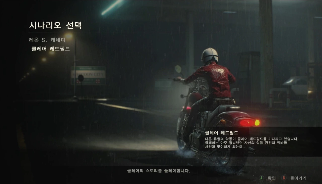 <RE:2>의 주인공은 클레어 레드필드(Claire Redfield)와 레온 케네디(Leon S. Kennedy) 두 명입니다. 빨간 가죽 재킷을 입고 모터사이클로 빗길을 달리며 등장하는 클레어 레드필드는 1편의 주인공 중 하나였던 크리스 레드필드의 동생입니다. 오빠와의 연락이 갑자기 연락이 두절되자 수상함을 느끼고 오빠가 근무하는 라쿤시티를 직접 찾아오는 엄청난 행동력을 가진 대학생이지요. 레온 케네디는 라쿤 시티의 신참 경찰입니다. 첫 출근을 기다리던 중 갑자기 라쿤시경(R.P.D.; the Raccoon Police Department)과의 연락이 두절되어 역시 수상함을 느끼고 직접 라쿤 시티로 향합니다. 본격적인 이야기는 클레어와 레온이 주유소에서 우연히 만나 함께 라쿤 시티에 도착하게 되면서 시작됩니다.
