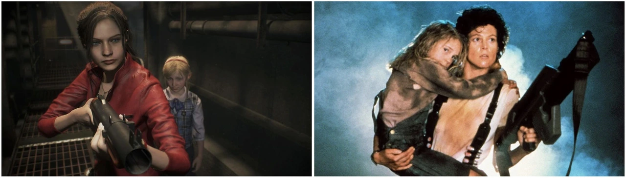 클레어의 이야기에서는 셰리 버킨(Sherry Birkin)이라는 소녀가 등장합니다. 셰리는 등장한 지 얼마 되지 않아 경찰서장에게 납치를 당하기도 하고 바이러스에도 감염되기도 하면서 많은 위기를 겪는데요, 처음엔 그저 경찰서를 탈출하려고 했을 뿐인 클레어는 이런 셰리를 만나면서 이 아이를 지키고 구출하겠다는 새로운 목표를 갖게 됩니다. 난폭한 괴물들 사이에서 끔찍한 경험을 겪은 어린 소녀와 이 아이를 보호하려는 강력한 여성이라는 부분에서 <에이리언 2>의 리플리와 뉴트를 떠올리지 않을 수가 없더군요. 실제로 게임 속 많은 부분에서 <에이리언> 시리즈의 영향으로 보이는 요소들이 있었고요. 다른 글에서도 이야기했지만 <에이리언> 시리즈를 너무 좋아하는 저로서는 굉장히 반가웠습니다.