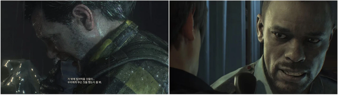 그리고 이 빈 곳을 조금이나마 채워주는 건 카를로스 올리베이라(Karlos oliveira)입니다. 카를로스는 질과 함께 플레이 가능한 캐릭터였어요. 질이 처음 전철을 타고 라쿤 시티 탈출을 시도하는 동안, 시점은 카를로스로 바뀌고 플레이어는 다른 임무를 수행하기 위해 <RE:2>의 첫 무대였던 라쿤 시티 경찰서를 방문합니다. 클레어와 레온이 방문하기 몇 시간 전인 만큼 많은 부분이 <RE:2>와 연결됩니다. 경찰서의 마지막 생존자였던 마빈 경감은 왜 부상을 입은 채 로비에 있었는지, 그리고 그가 <RE:2>의 주인공에게 준 조언이 어떻게 나오게 된 건지도 알 수 있었어요. 또 경찰서 복도 구석에서 끔찍한 몰골이 되어 있던 경찰들이 어떻게 죽은 건지도 직접 목격할 수 있었고요. 재미있는 연결점이었습니다.