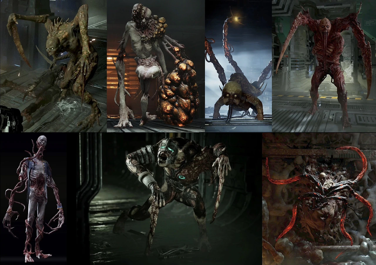 주요 적으로 등장하는 네크로모프는 시체가 변형을 일으키며 탄생한 괴물입니다. 처음에는 그냥 날카롭고 징그럽게 생긴 괴물 정도로만 보여서 조금 심심했는데요, 하지만 다양한 종류가 등장하고 종류마다 서로 다른 개성을 갖고 있다는 걸 알게 되고 나서는 점차 매력적으로 보이기 시작했습니다.