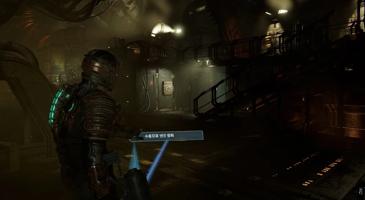 첫인상은 아주 좋았습니다. 차갑고 어두운 공간을 비추는 나약한 빛줄기와 정교하고 묵직한 기계들이 맞물리는 소리들이 너무나 매력적이었어요. <에이리언: 아이솔레이션>의 세바스토폴 무서울 만큼 조용하고 건조한 느낌의 우주정거장이었다면 <데드 스페이스>의 USG 이시무라는 시종일관 기괴한 노이즈로 가득하고 습기와 기름기가 가득한 거대 우주선이었습니다. 특히 세이브 스테이션과 상점을 이용할 때 볼 수 있는 기계적인 느낌이 정말 좋았어요. 기름 칠 잘 된 금속 톱니바퀴와 체인이 움직이는 듯한 소리와 빠르고 매끄러운 움직임 때문에 처음엔 별 이유 없이 열었다 닫았다를 반복해보기도 했습니다.