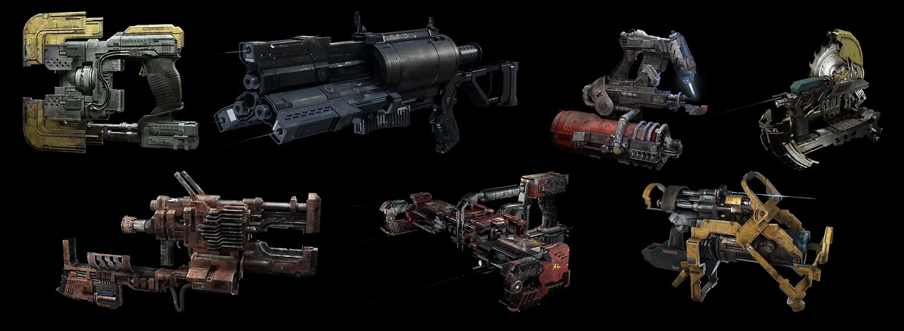 무기 종류가 지나치게 많지 않아서 좋았습니다. 전부 일곱 종류가 있는데 한 번에 네 종류를 장착할 수 있어요. 그래서 상황에 따라 무기를 미리 조정해 둬야 했고, 앞에서 말한 것처럼 적 모두 각각의 특징이 있어서 어떤 무기를 골라두느냐를 고민하는 재미도 있었습니다. 플라즈마 커터는 가장 다양하게 쓸 수 있지만 효과적으로 쓰기 위해서는 조준을 잘해야 하고, 펄스건은 타격감은 좋지만 화력이 약하고, 포스 건은 여러 적에게 포위되었을 때 유용하고 보스전 때 잡몹을 쫓아내기에는 좋지만 탄약이 비싼 데다 단거리에서만 쓸 수 있고, 컨택트 빔은 가장 강력하고 보스 전 때 유용하지만 발사에 시간이 걸리는 등등. 덕분에 다른 게임에서는 가장 효과적인 무기 한 두 개를 계속 쓸 때가 많았는데 <데드 스페이스>에서는 거의 모든 무기를 고루 돌려가며 썼어요.