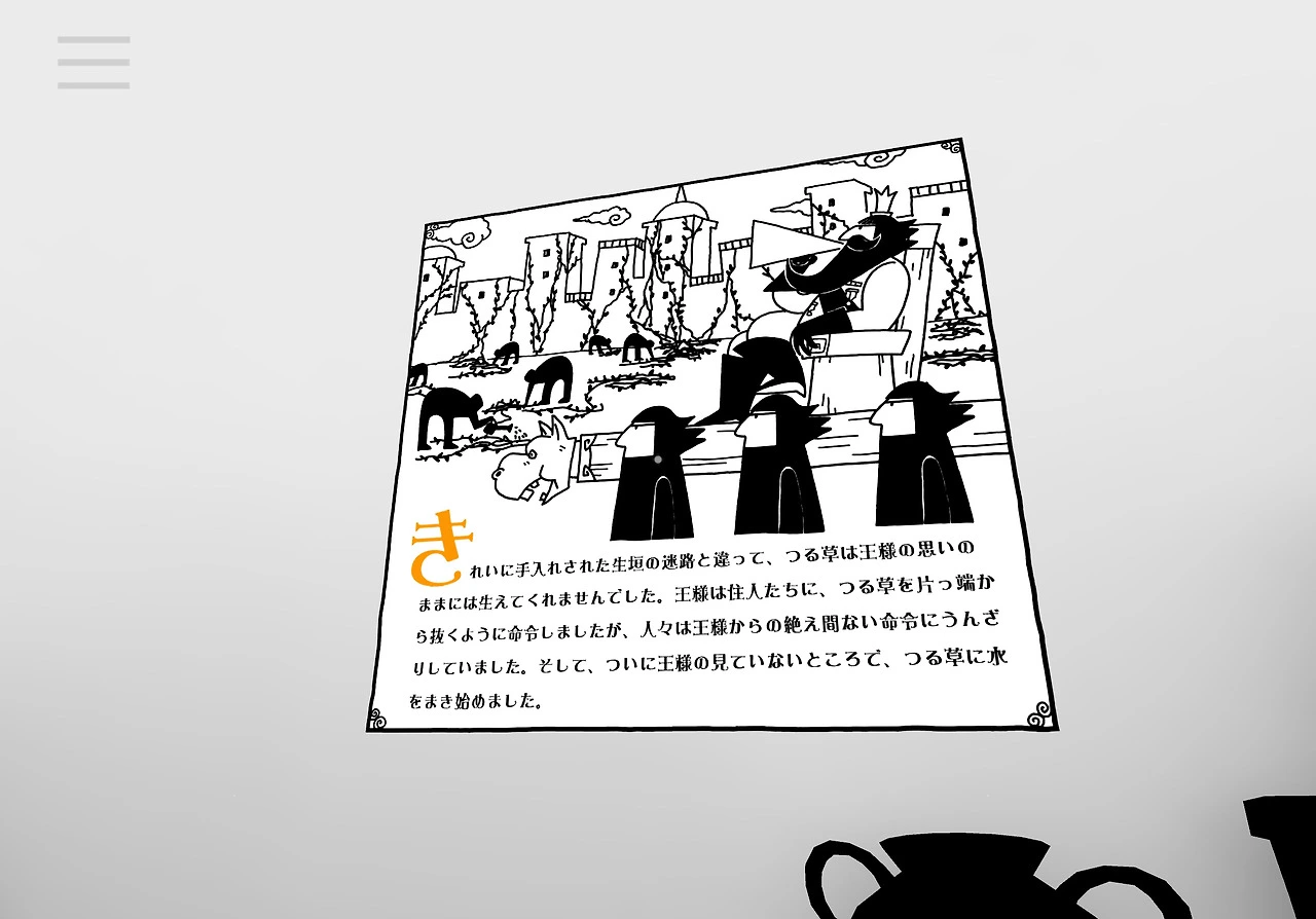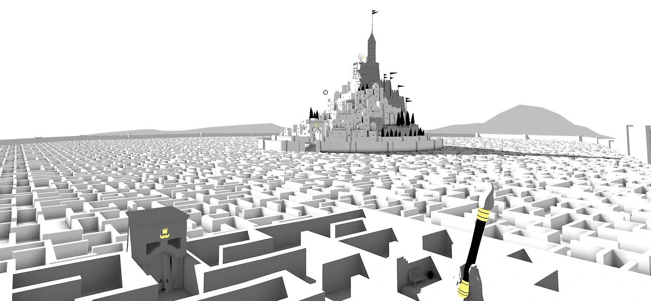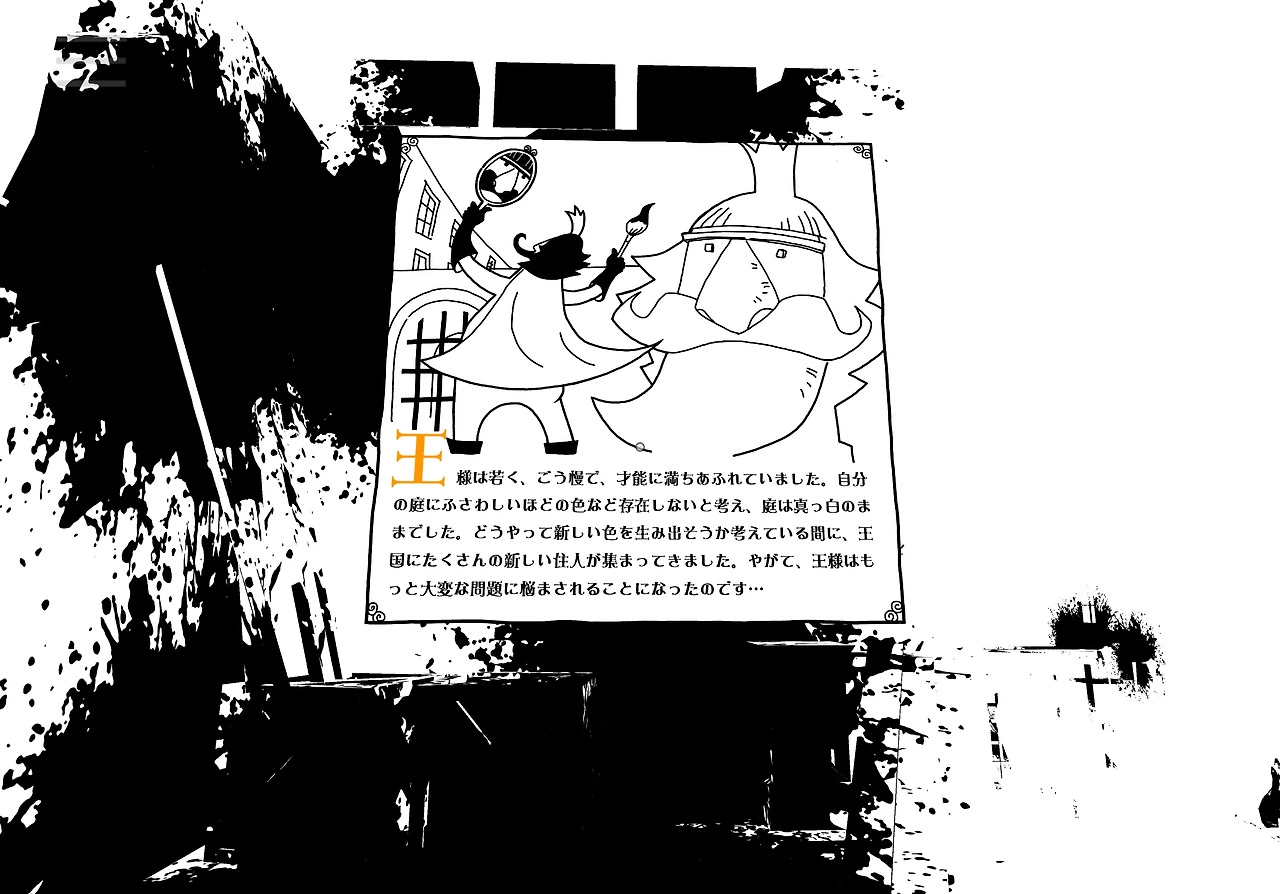 이 순백의 세상을 통치하는 왕이 있습니다. 왕은 백성들이 아무것도 보이지 않아 난처해하자 그림자를 만들어줘요. 그렇게 진입한 두 번째 스테이지에는 흰색과 검은색에 더불어 회색도 생겨납니다. 그렇게 게임을 진행하는 동안 공간은 계속해서 다채롭게 바뀌어요. 다양한 퍼즐이 존재하는 마을을 지나기도 하고 미로나 성, 해안가를 걷기도 합니다. 그저 잉크만 던지며 나아가는 것도 아닙니다. 물방울을 던지기도 하고, 그 물방울로 식물을 끌어와 새로운 길을 만들기도 해요.