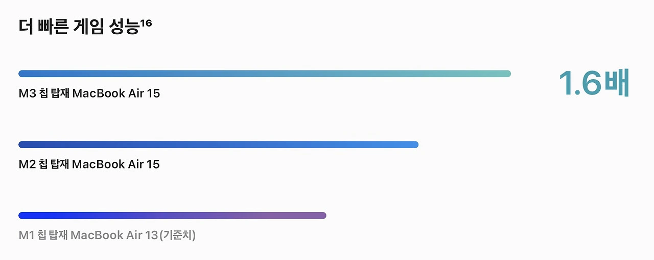 내년 초에 M4 맥북 에어가 나온다고 하니 그걸 기다리는 것도 좋았겠지만, 평소에 하는 일들은 이미 M2로도 차고 넘쳤기 때문에 M3와 M4의 성능 차이가 제게 체감될 정도일 것 같지는 않았어요. 그나마 성능을 끌어 쓰는 게임의 경우, 적어도 애플이 공개한 자료를 보면 M3와 M4 사이에선 10% 정도밖에 차이가 없는 것 같고요. 마침 M2/M3 모델이 제법 큰 폭으로 할인도 하고 있기도 했고요. 그렇다고 M2를 고르지 않은 건 M2와 M3 사이에선 게이밍 성능에 제법 차이가 있는 것 같은 데다, M3에는 하드웨어 가속 레이 트레이싱이나 메시 셰이딩 같은 게임 경험을 올려주는 별도의 기능이 들어가 있기 때문이었습니다. 사실 레이 트레이싱은 이야기를 들을 때마다 굳이 그렇게까지 해야 하나라는 생각이 들었는데 그래도 꼭 경험해 보고 싶기는 했어요.