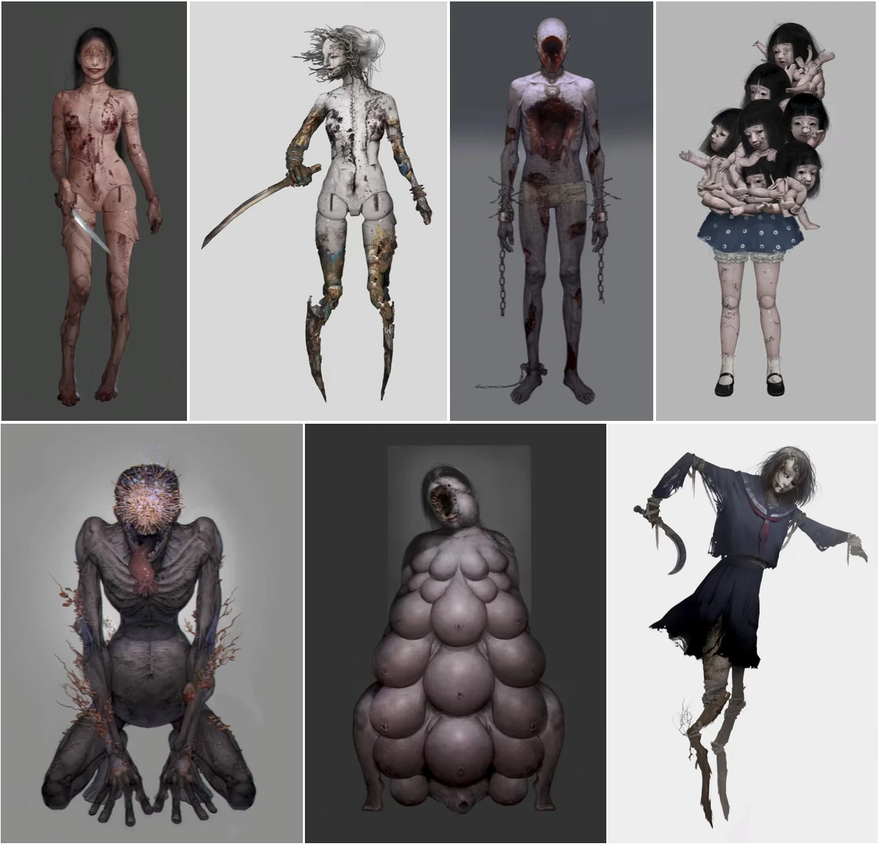 괴물의 상징성에서도 그 차이가 드러납니다. <사일런트 힐 2>의 괴물들은 극도로 사적인 상징입니다. 제임스(혹은 안젤라)의 삶이 아니면 설명될 수 없는 형상을 하고 있지요. 그 기괴함은 특정 인물의 내면에서만 성립하는 공포였어요. 반면 <사일런트 힐 f>의 괴물들은 성차별적 사회나 폐쇄적 공동체 속 억압의 맥락을 알고 있다면, 굳이 히나코라는 개인을 거치지 않아도 어느 정도 해석이 가능합니다. ‘이 사람만의 악몽’이라기보다는 ‘그 시대 그 상황 속에서 나타날 법한 은유’에 가까웠던 거죠.
