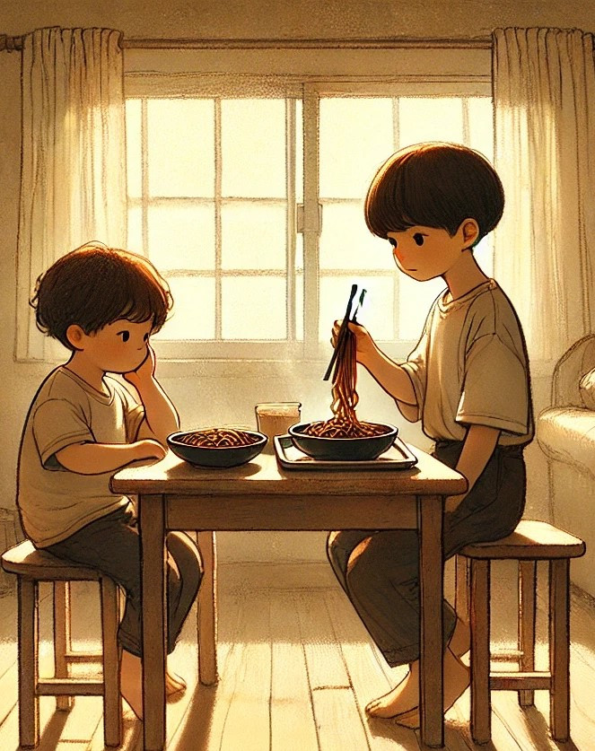 대문 가운데 작은 구멍으로 밖을 내다보니, 형제반점 배달 아저씨가 환하게 웃고 있었다. 조심스럽게 문을 열자, 아저씨는 익숙한 손놀림으로 철가방을 내려놓고 불향 가득한 간짜장 두 그릇과 노릇하게 구워진 군만두를 꺼냈다.