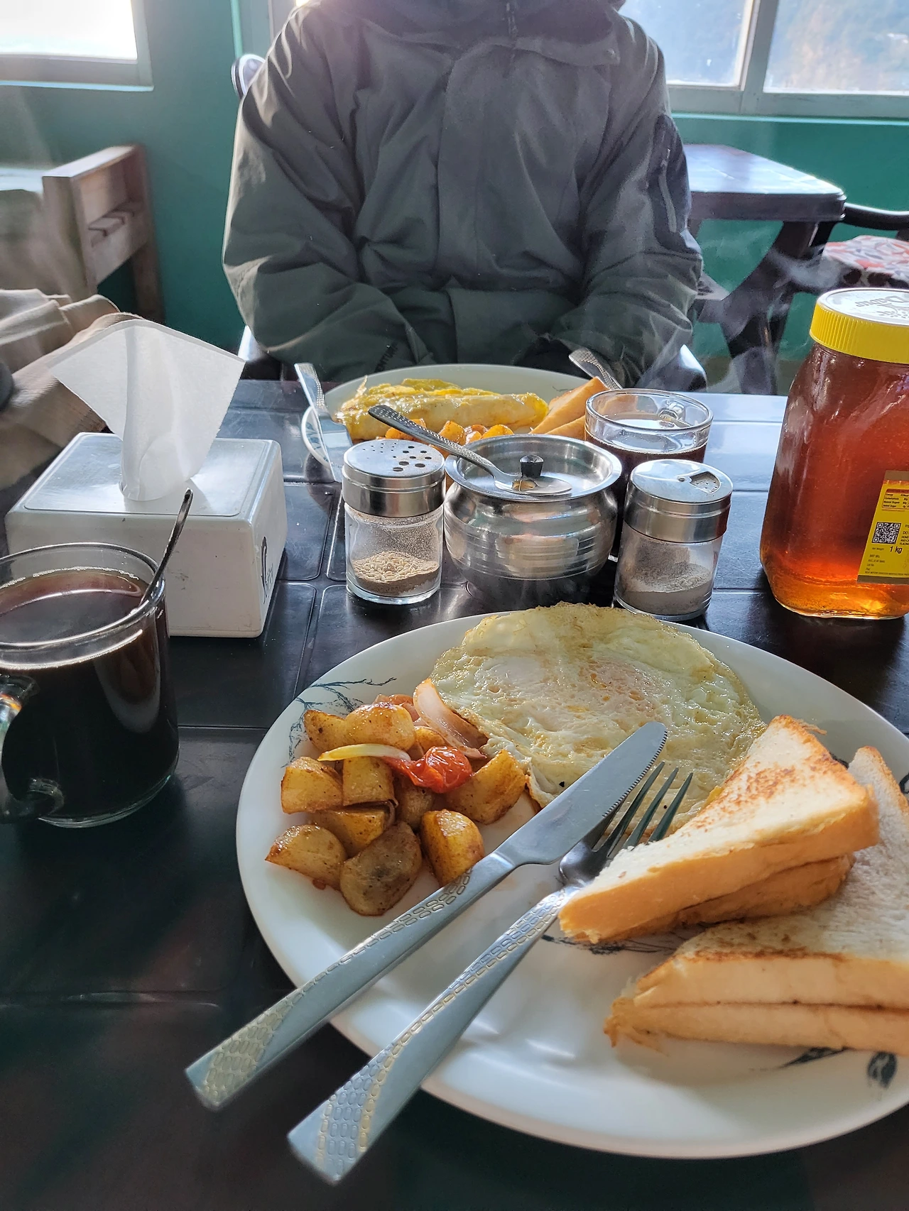 물론 항상 힘들지만, 제일 고통스러운 순간은 아침에 멀쩡히 일어났을 때이다. 몸이 죽을 만큼 아프면 내려가기라도 할 수 있지만 그 정도로 아프지 않았다. 오늘도 고산병에서 살아남기 위해 밥을 든든하게 먹고 아침을 시작한다. 달밧이 너무 좋지만 아침부터 먹고 싶지 않아서 아침은 브런치 세트로 먹었다. 여기에서 제공해 주는 꿀이 아주 기가 막히다.