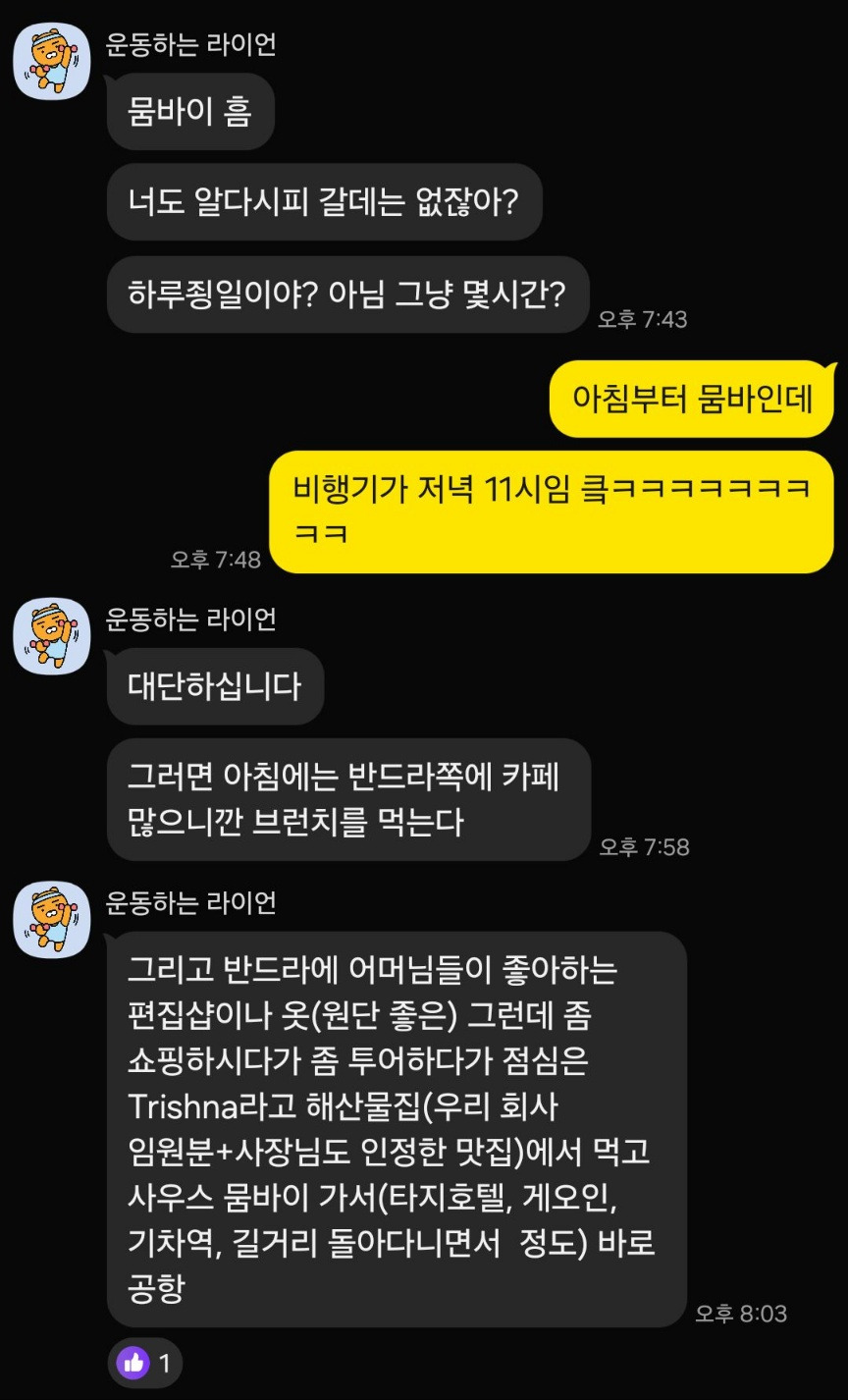 아빠는 다른 지역으로 가신 뒤로는 제가 엄마와 친구분들을 모셔야 하잖아요. 그래서 더더욱 마지막 마무리를 잘해야겠다고 생각했어요. 그래서 뭄바이에서는 못했던 쇼핑이랑 퀄리티 좋은 음식을 찾아드리려고 노력 많이 했어요