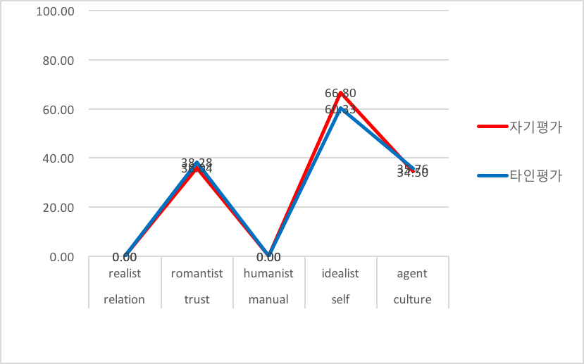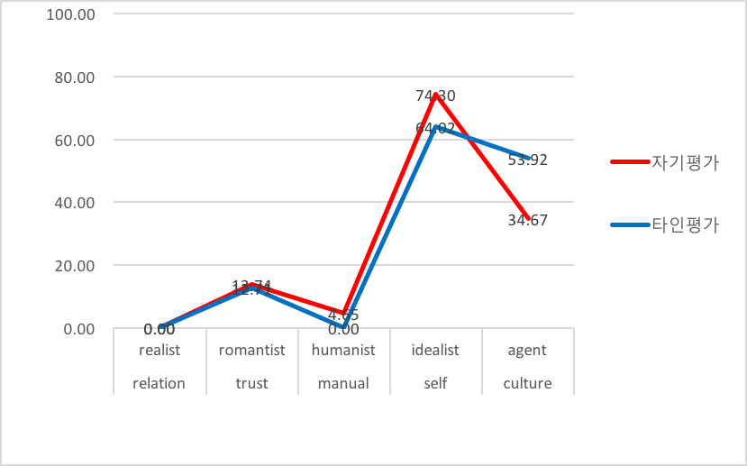 고경만씨는 평상시에는 아이디얼리스트의 성향만이 뚜렷 하다가, 새로운 환경에 적응하는 동안에는 로멘티스트 성향이 높아지는 것으로 보입니다.