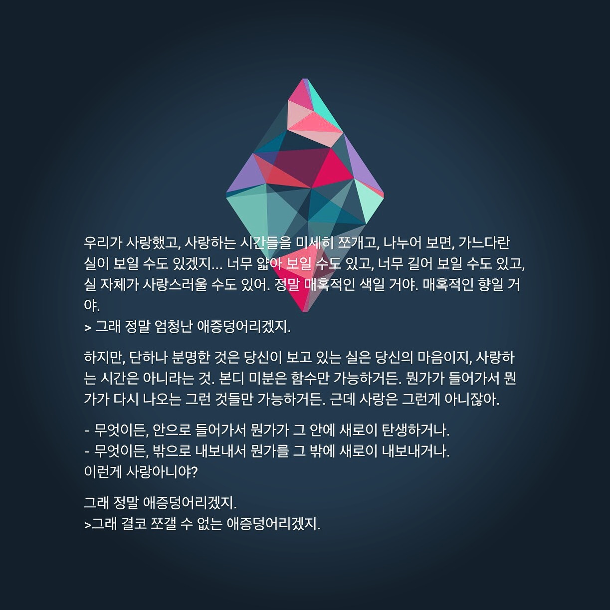 우리가 사랑했고, 사랑하는 시간들을 미세히 쪼개고 나누어 보면 가느다란 실이 보일 수도 있겠지...