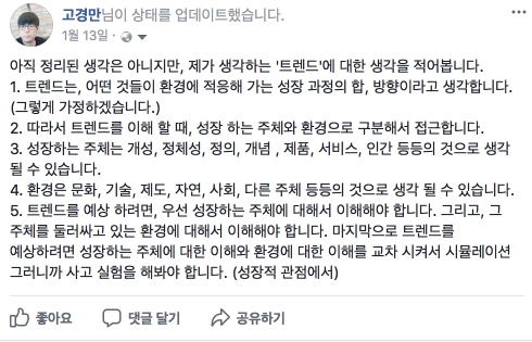 지금 세상이 변하는 속도가 유래 없이 빠른 것 같다. 그런 탓인지 트렌드와 변화를 이해하고자 하는 사람들이 매우 많아졌고, 서점가에서 트렌드를 다루는 책들이 나오기 시작한 것은 이미 오래전 일이다. 사람들은 트렌드를 활용하고 싶어 한다. 그리고 활용하기 위해 이해하고 싶어 한다. 하지만 트렌드/변화를 이해하는 원리를 제시하는 책들은 매우 드문 것 같다. 올해 1월 다음과 같은 관점을 적었다.