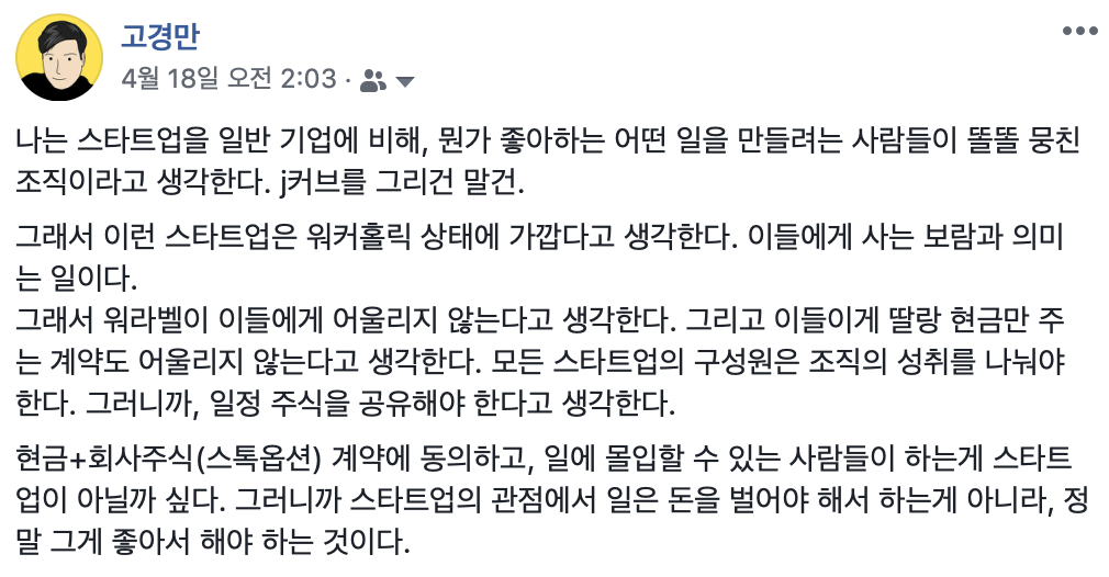 위에도 썼듯이 저는 j커브를 그리면서 성장하는 기업들이 스타트업이라고 생각하지 않습니다. 조직 구성의 관점에서 조직을 구성해야 한다는 기본적인 생각이 있으며, 스타트업은 '정말 그 일이 좋아서, 그 일에 빠져서 일하는 사람이 모인 조직'이라고 생각합니다. 대표나 경영진도 이런 스타트업의 노동자, 워커홀릭형 노동자에게는 그에 걸맞은 대우와 보상을 해줘야 한다고 생각합니다. 역시나, 워커홀릭형 보상이 되겠죠.