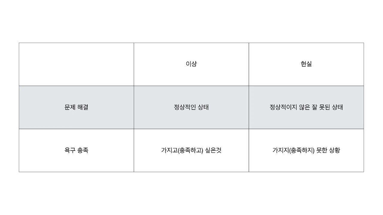 이 이상과 현실을 바로 우리가 이해하고자 하는 욕구 충족과 문제 해결이 가리키는 바라고 할 수 있다. 다만 표현하는 언어가 다음과 같이 다를 뿐이다.