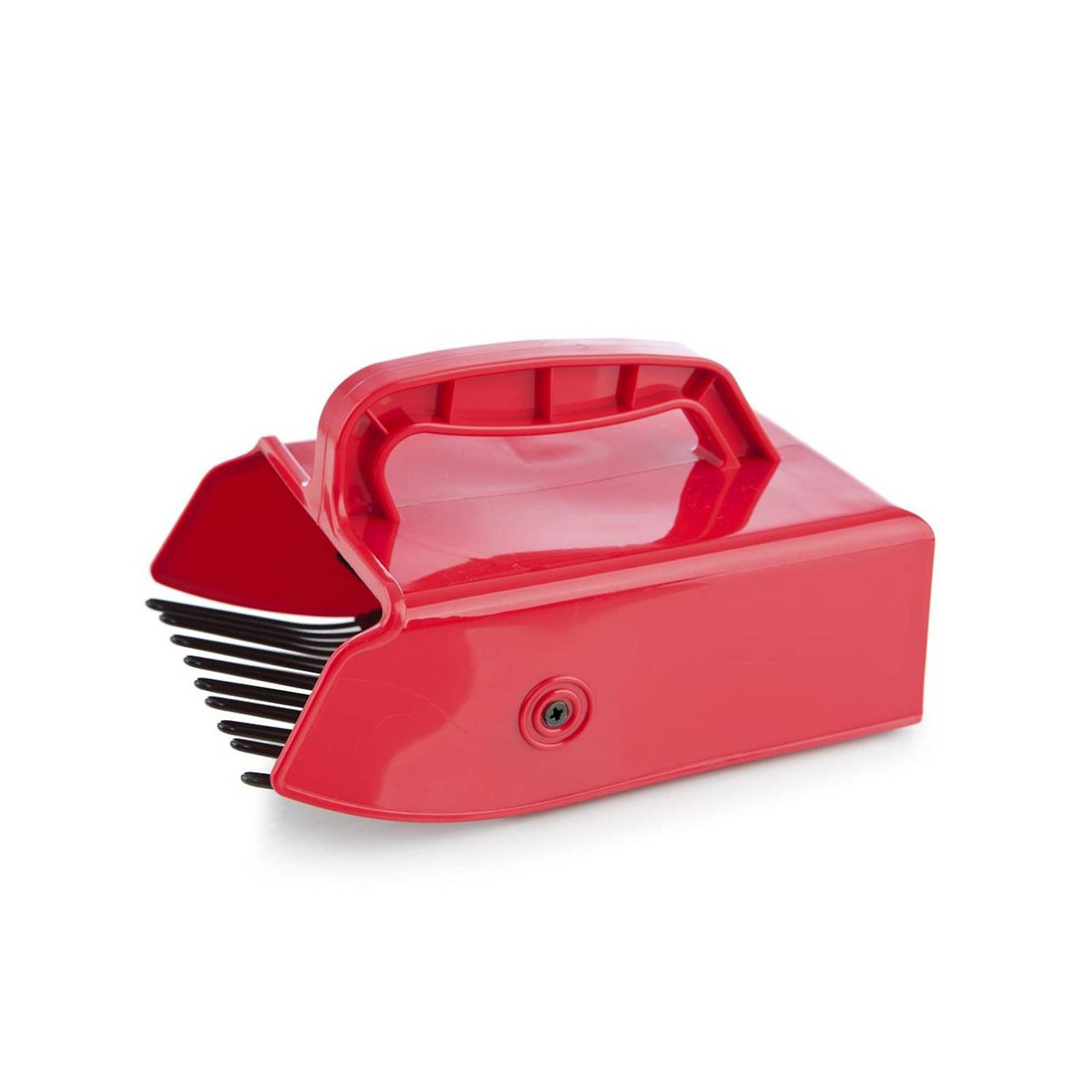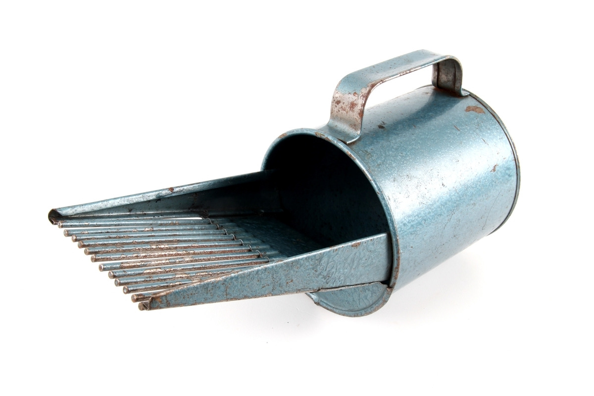 그다음엔 철 소재로 된 블루베리 픽커를 볼 수가 있다. 어떠한 마감칠 없이 철로 만들어진 버전, 그리고 겉면에 녹슮 방지를 위해 붉은 에나멜페인트로 칠한 버전을 볼 수가 있다. 아마도 이 에나멜페인트로 칠해진 버전이 현재 가장 흔한 볼 수 있는 붉은 플라스틱 베리 피커의 시초인 듯하다. 또한 초록색이 가득한 숲 속에서 잘 보일 수 있게끔 붉은색이 가장 선호된 게 아닌가 싶다.