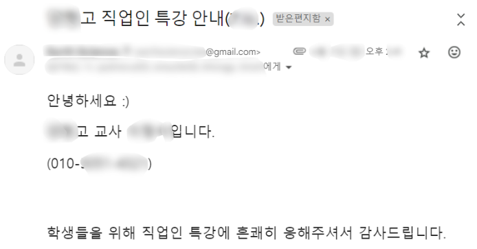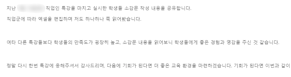 아, 담당 선생님께서 직업인 특강 후기도 전달해 주셨다.