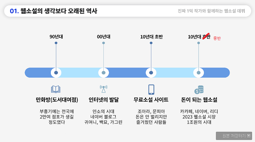 내가 수업하는 자료 중에 하나인데, 웹소설을 짧은 역사로 생각하지 말라는 페이지다. 웹+소설이라는 단어가 신조어일 뿐 그 역사는 대여점 시절부터 이어져 왔으니까. 그렇다고 해서 당시의 작가들이 온전히 웹소설 판으로 넘어오진 않았기 때문에 기성의 수가 매우 적었다.