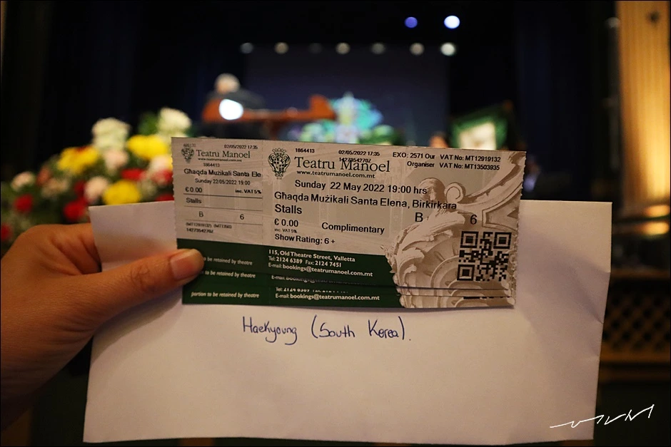 이날 연극을 앞에서 본 지인은 배우들의 표정 하나하나까지 생생하게 볼 수 있었어 너무 좋았다고 했다. 몰타를 떠나기 전에 영어가 얼마나 늘었는지 확인도 할 겸 앞자리에서 연극 공연을 한번 더 보고 싶었는데 이후로 연극공연은 없어서 아쉬웠다. 대신 클래식 공연이 무료로 열렸는데 좌석은 주최 측으로 메일을 보내야 한다고 했다. 용기를 내서 공연을 보고 싶고 가급적 앞 좌석에 앉고 싶다는 메일을 보냈더니 주최 측에서 좌석을 확보해 줬다. 막상 극장에 도착해서 보니 앞에서 두 번째 줄이었고 너무 코앞이라 엄청 부담스러웠다. 게다가 그 많은 사람 가운데 한국인, 아니 외국인은 정확히 나와 룸메이트 밖에 없었다. 주최 측에서도 이 공연을 보러 온 우리를 상당히 흥미로워했다.