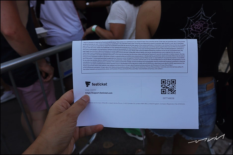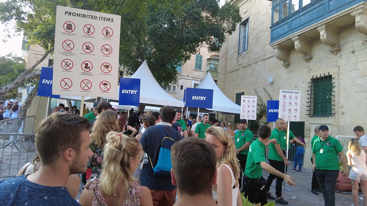 무료 공연이긴 하지만 사전에 공식홈페이지를 통해 티켓을 예매를 해야 하고 입장권을 지참한 사람만 공연장에 들어갈 수 있었다. 일전 BBC 콘서트 때도 엄청난 사람이 모였는데 그때와는 분위기가 사뭇 달랐다. 몰타에서 최대의 인파가 모이는 공연인만큼 만에 하나라도 있을 불상사에 대배하기 위해 입장부터 매우 엄격했다. 무엇보다 스탠딩 공연으로 진행되기에 카메라, 삼각대, 휴대폰 삼각대 등 공연 촬영 장비는 물론이고 백팩, 우산, 유리병, 가위, 깃발, 스테인리스 물병 등 반입금지 물품도 이전 공연에서 볼 수 없을 정도로 엄격했다.