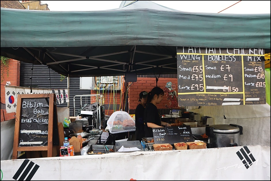 이런저런 구경을 하고 있자니 슬슬 배가 고파지는데 포토벨로 로드 마켓 끝 부분은 전부 음식 존이다. 세계 각국의 음식이 다 모였구나 싶었다. 이곳저곳을 기웃거리다 보니 오~ 한국 양념통닭이 있는 것이 아닌가.