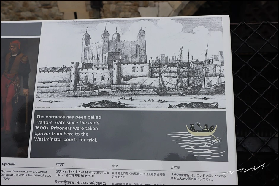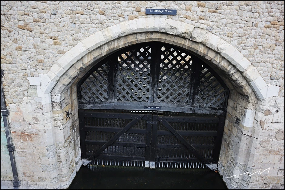런던타워를 한 바퀴 돌아 템즈강과 접하고 있는 성벽을 지나다가 희한한 출입문이 눈에 띄었다. 벽면에 St. Thomas's Tower라고 적혀있는데 토마스 모어는 영국의 법률가로 '유토피아'를 쓴 사람이 그의 이름이었다. 왜 이 사람의 이름이 이렇게 적혀있을까 궁금했다. 아래에는 반역자의 문(Tritors' Gate)이라고 써져 있는데 배를 타고 템즈강에 도착한 죄수들이 런던타워를 들어갈 때 이 문을 통해 들어갔고 그렇게 불리는 모양이었다. 게다가 토마스 모어도 이 문을 통해 들어갔다고 한다.