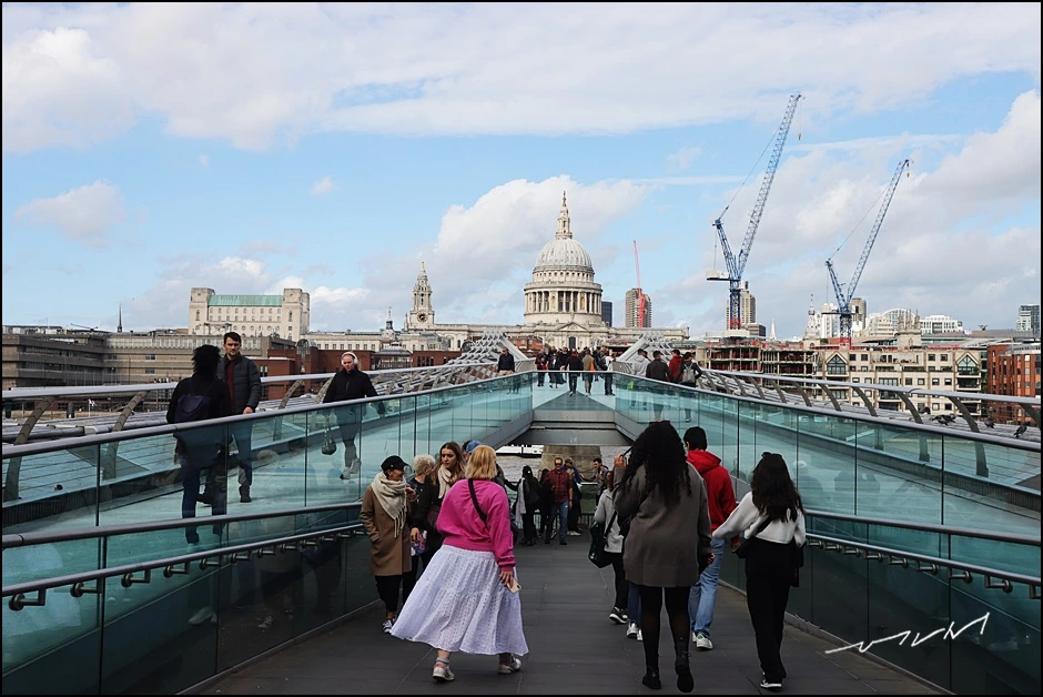 밀레니엄 브리지는 약 370m이니 아무리 천천히 걸어도 채 10분 정도면 충분히 다리를 건널 수 있다. 하지만 이 다리는 도무지 빨리 건널 수 없는 다리다. 다리 위에 올라서면 누구라도 카메라 셔트를 누르지 않을 수 없다. 정면으로 보이는 세인트폴은 웅장하고 뒤로 멀어지는 테이트 모던은 그곳이 발전소였음을 뒤늦게 확인하다. 다리 위에서 바라보는 템즈강도 아름답고 템즈강에 늘어선 빌딩마저도 눈길을 사로잡는다. 그러니 누구라도 10분 안에 밀레니엄 브리지를 걷는다는 것은 무리다.