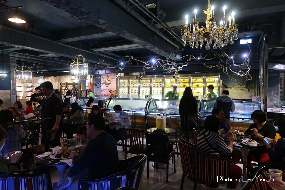 길거리에 서서 먹는 것이 조금 그렇다면 이번엔 은행으로 가면 된다. 은행에서 아이스크림이라니 또 웬 뚱딴지같은 소리냐 싶지만 옛날에 은행이었던 제4신용 합작사(第四信用合作社) 역시 일출의 분점이다. 궁원 안과에서 큰길을 따라 몇 블록 걸어내려 오니 채 10분이 걸리지 않아 제4신용 합작사에 도착했다. 입구에 들어서려는 순간 센스 넘치는 인테리어에 역시! 라며 감탄하지 않을 수 없었다. 궁원 안과와 마찬가지로 은행의 이름을 그대로 사용할 뿐만 아니라 은행에서 가장 중요한 금고문을 출입문으로 사용하고 있는 것이 아닌가. 자세히 둘러보니 은행의 시설물을 그대로 인테리어에 활용했는데 독특한 느낌이 들었다. 게다가 건물 위쪽은 저녁이 되니 화려한 조명이 현대적이면서도 세련된 느낌을 자아낸다. 육중한 금고문을 열고 안으로 들어서니 가는 날이 장날이라고 1층 2층 모두 빈자리가 없을 정도로 사람들이 많았다. 이곳저곳 둘러보는 사이에 다행히 빈자리가 생겼다.