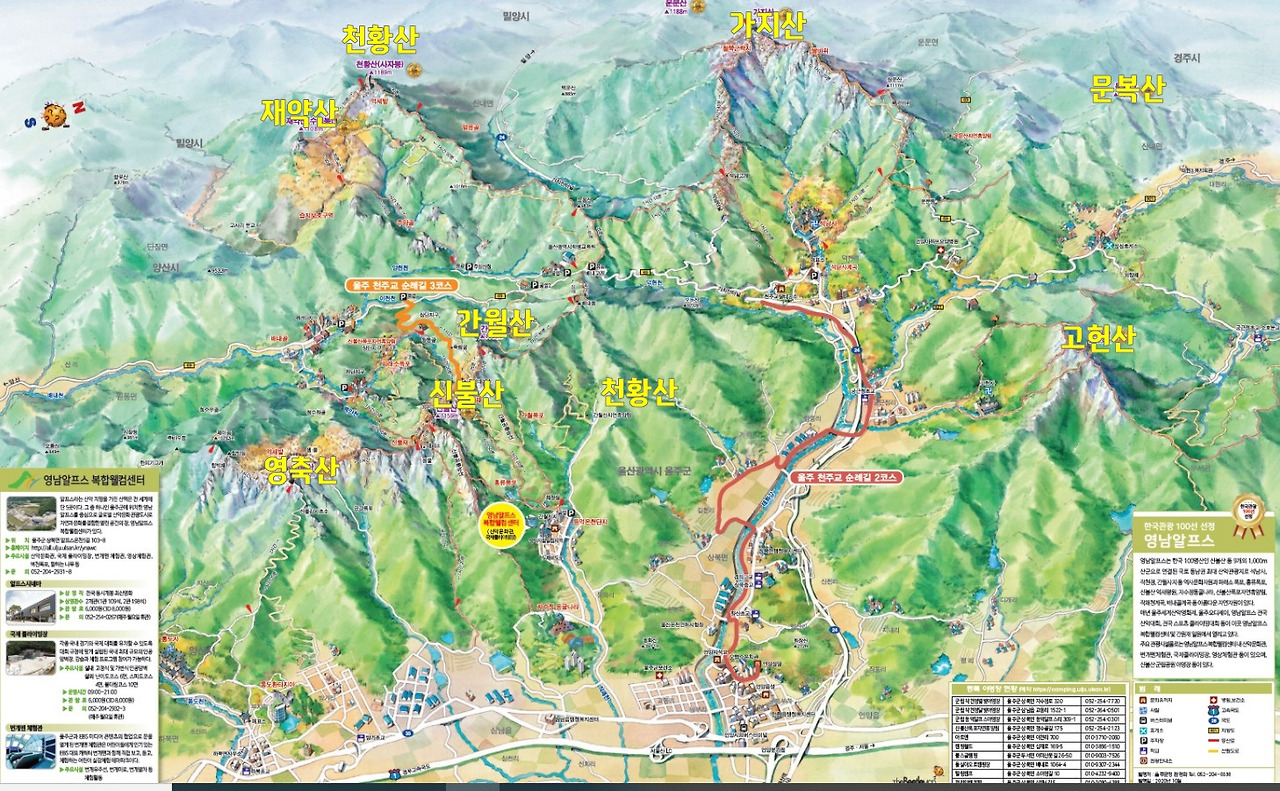 영남 알.프.스? 스위스 알프스가 영남에도 있다는 말인데.. 누군가는 '영남 알프스'가 처음 듣는 생소한 단어일 테지만 산을 좀 탄다는 사람들에게 영남알프스는 매우 유명한 산이다. 영남알프스는 가지산을 중심으로 해발 1,000미터가 넘는 여러 개의 산이 병풍처럼 두르고 있는 모습이 마치 알프스처럼 아름답다고 해서 붙여진 이름이다. 워낙 산새가 아름다워 등산 애호가들에게 큰 사랑을 받고 있는 영남알프스는 이중 9개의 산이 해발 1,000m가 넘는다. 가장 형님 격인 가지산(1,241m)을 시작으로 간월산(1,069m), 신불산(1,159m), 영축산(1,081m), 천황산(1,189m), 재약산(1,108m), 고헌산(1,034m), 운문산(1,188m), 문복산(1,015m)이 울산, 청도, 밀양, 경주, 양산 5개 지역에 걸쳐 아름다운 풍경을 자랑하고 있다.