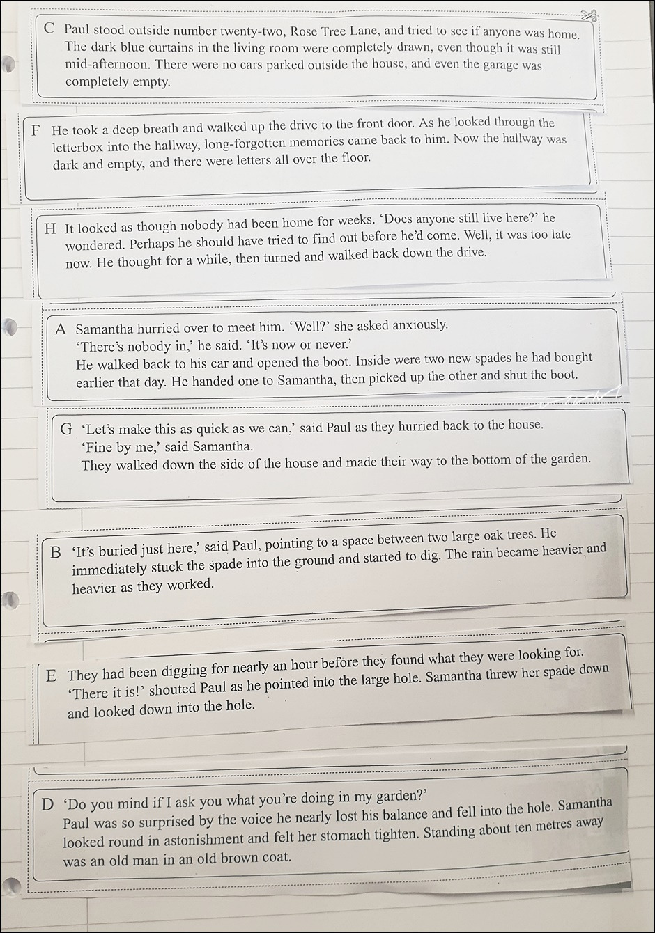 어느 날은 선생님이 단편소설을 준비해 왔다. 4~5명씩 그룹을 나눈 후 문장을 잘라서 다 섞고 난 뒤에 텍스트를 바탕으로 줄거리를 유추해 원래 소설의 순서를 유추하는 수업도 진행됐다. 내용도 이해해야 하고 이해한 내용을 바탕으로 원래 소설의 순서를 맞춰야 했다. 원래 줄거리가 있는 정답이지만 내가 생각했을 때 이 문장 다음에 다른 문장으로 원 소설과는 다른 내용을 만든 것을 합리적으로 선생님을 설득시켜야 하기도 했다. 수업은 재미있었지만 쉽지는 않았다.