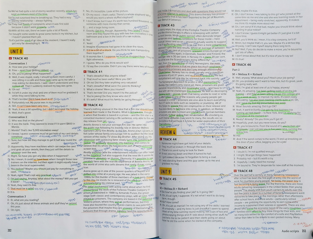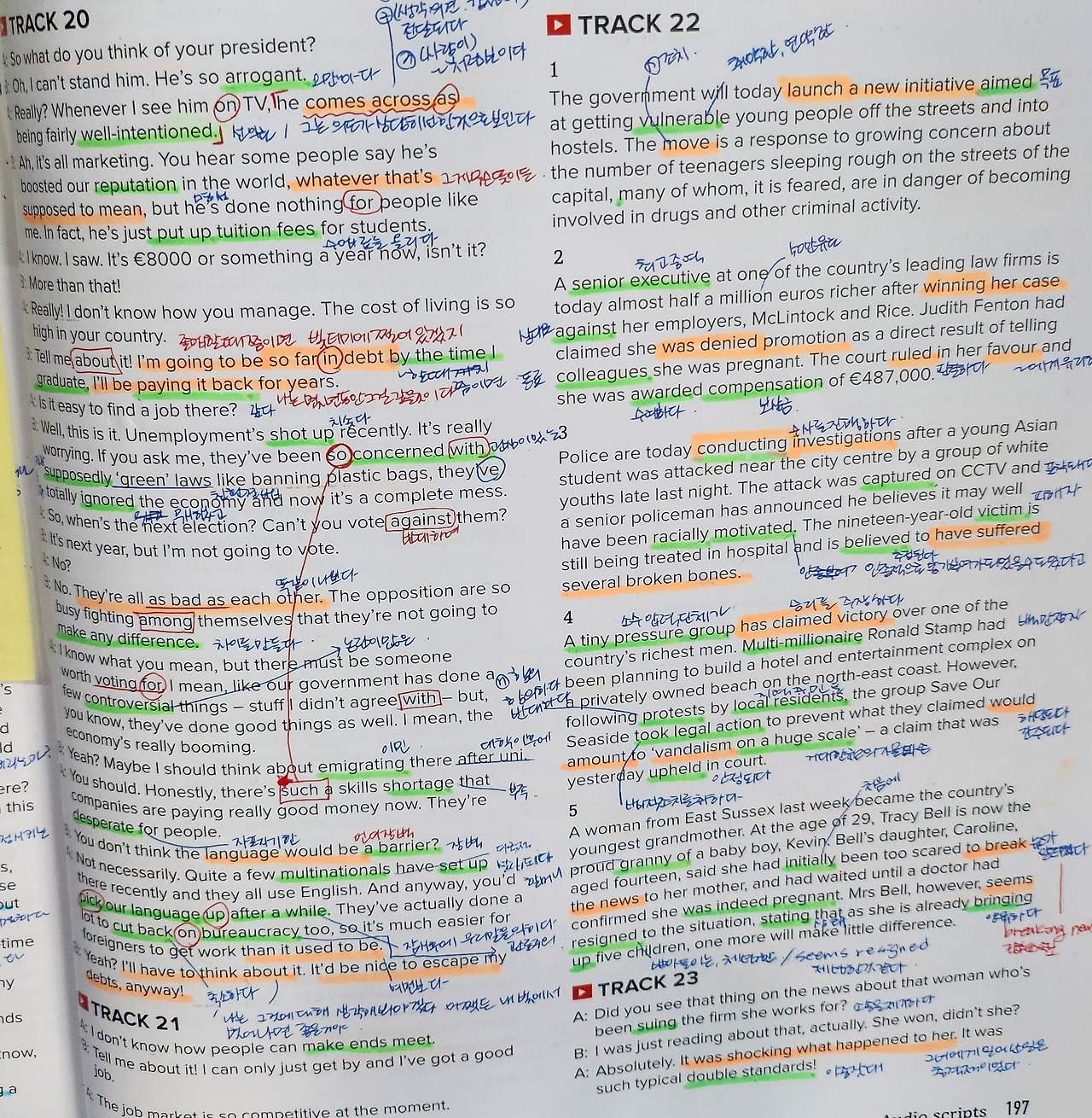 레벨테스트 통과하고 좋았던 건 결과를 확인한 딱 그때뿐이었다. 레벨이 올라간 후 첫 수업은 언제나 어렵게 느껴지기 마련인데 어퍼인터미디어트 수업은 그런 차원이 아니었다. 어려운 건 당연했고 어퍼인터미디어트에서 배우는 내용들이 인터미디어트 수업과는 차원이 달랐다. 인터미디어트 때부터 미친 듯이 외워야 했던 단어보다 외워야 할 단어가 더 많이 쏟아졌다. 본격적으로 구동사(phrasal verb)가 등장하니 내가 알고 있는 동사의 뜻도 전부 새로 외워야 하는 상황이 됐다.