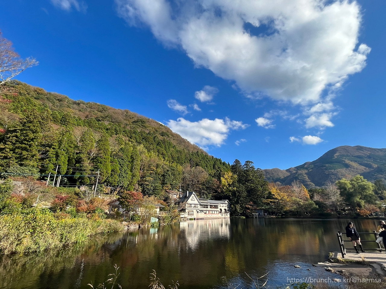 생각보다 아담하다 싶은 첫인상을 안고 찬찬히 주변 산책로를 따라 걸었다. 신기하리만치 높고 푸른 하늘과 막 단풍이 들기 시작한 산의 대비 덕분일까, 마주한 호수 전경은 내내 길에서 본 풍경보다 깊은 색이었다. 정면으로 보이는 펜션의 옛스러움도 고즈넉한 분위기를 더해주었다. 맑은 호수에 그 모든 것이 반사되는 모습을 보고 있자니 진부하지만 수채화 같다는 표현 밖에 떠오르지 않았다.
