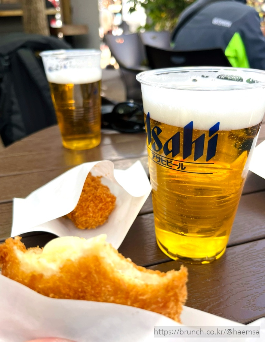 초록으로 가득한 시골길을 걸으며 잔뜩 신이 났지만 역시나 면 요리는 소화가 빠른 법. 출출한 기분이 들 때쯤 금상고로케 간판을 발견했다. 갓 튀긴 고로케를 매장 옆 야외 테이블에서 바로 먹어볼 수 있다는데 이걸 어떻게 참느냔 말이지. 기본, 치즈, 고기감자, 게살크림까지 네 개를 사다 반절씩 나눠 먹었다. 산뜻한 바람에 생맥주까지 한 잔 곁들이니 다시 힘이 나서 관광지 특유의 활기로 가득한 플로럴 빌리지를 가로질러 긴린호수로 향했다.