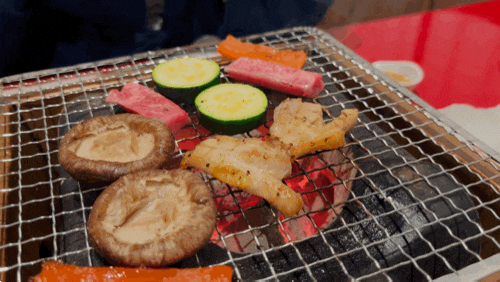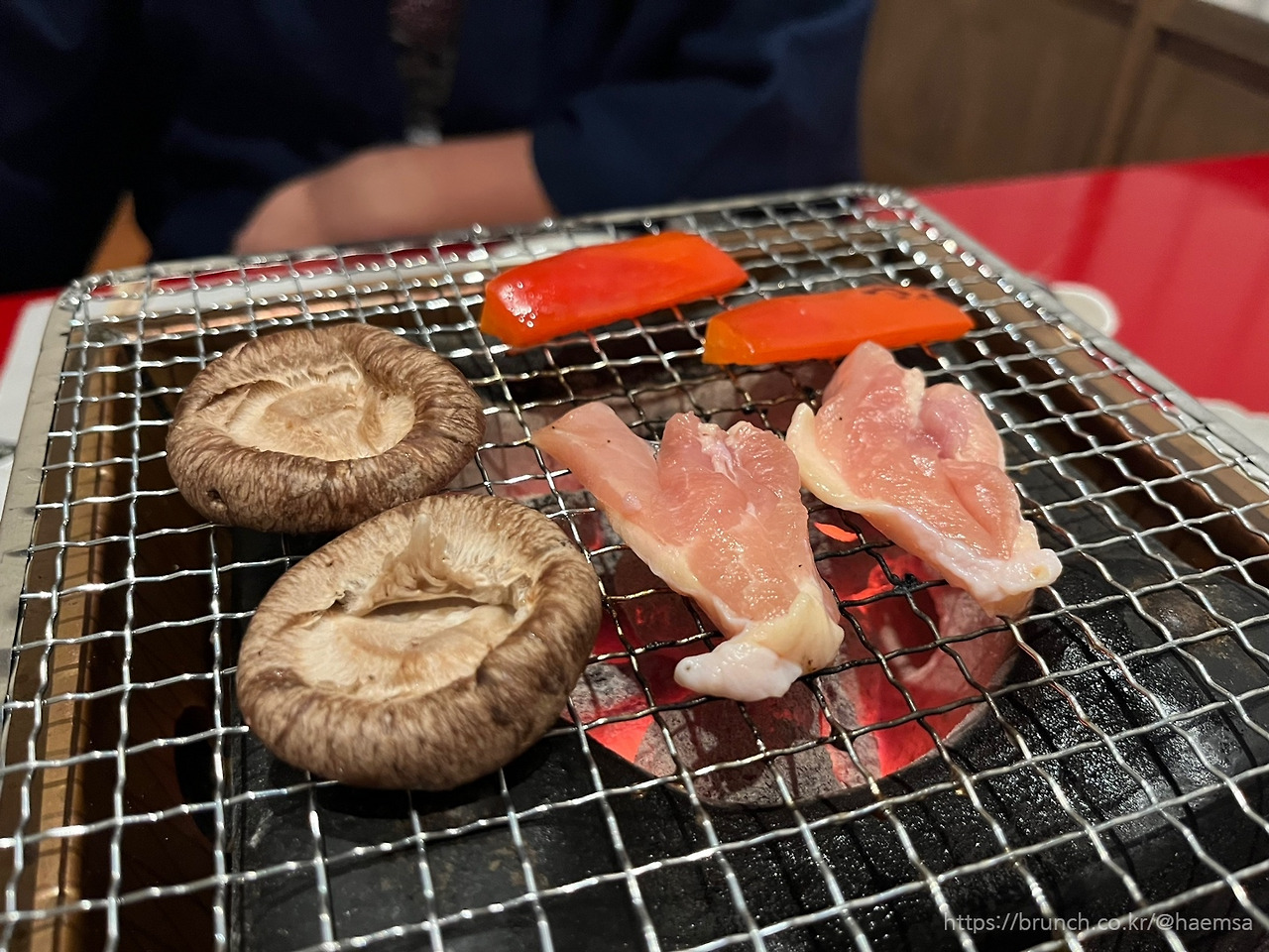 메인을 먹을 때가 되니 작은 화로를 가져다주셨다. 오이타 특산 소고기 분고규와 미야자키 토종닭이라는 휴우가도리에 호박이며 버섯도 함께 구워주고 고구마 소주도 곁들이기 시작했다. 이때부터였을까... 맛있는 술과 음식에 점점 기분이 좋아지기 시작한 것이...