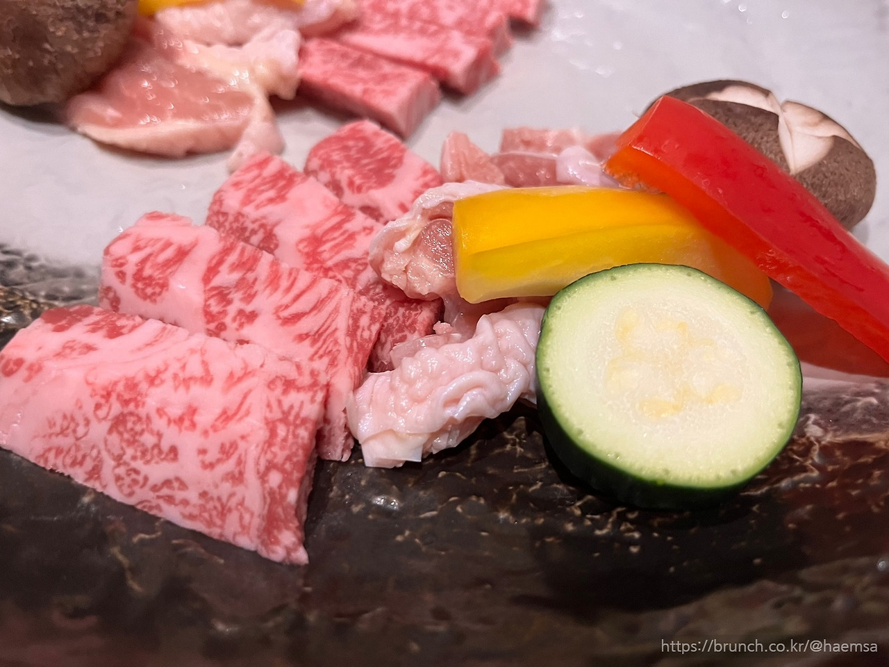 김이 모락모락 나는 노천탕에 눌러앉아 있으려니 슬슬 허기가 졌다. 마침 예약해 둔 저녁 시간이 다가와 노곤하니 풀어진 몸을 일으켰다. 콘자쿠앙 가이세키 석식은 샤브샤브 코스와 야끼니꾸 코스 중 하나를 선택할 수 있었다. 기본 샤브샤브 코스는 객실 내에서, 추가금이 붙는 야끼니꾸 코스는 식당 건물에 마련된 별실에서 진행되는데 아마 고기 구울 때 나는 연기 때문인 듯. 야끼니꾸 코스를 선택한 우리는 유카타 위에 쌀쌀한 바람을 막을 덧옷까지 야무지게 껴입고 식당 건물로 사부작사부작 걸어갔다.