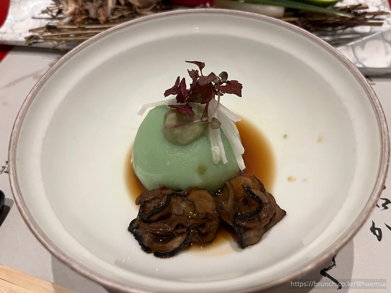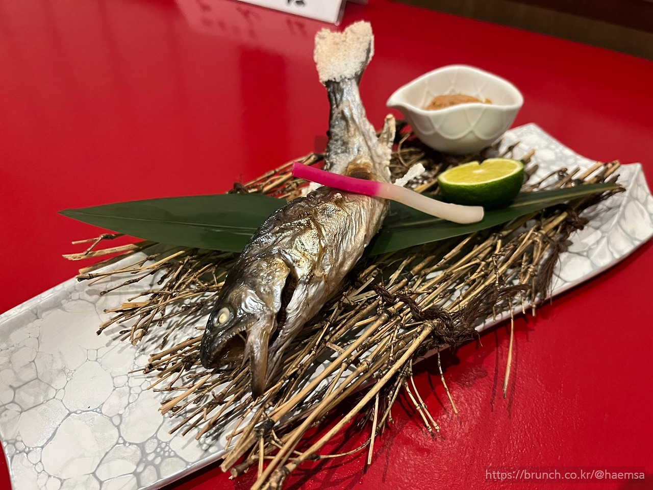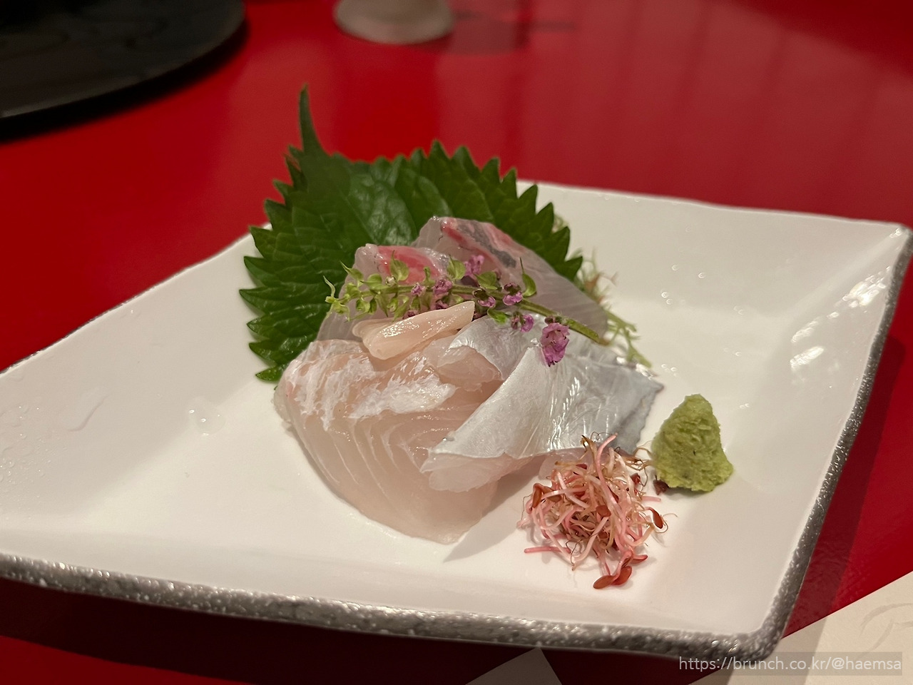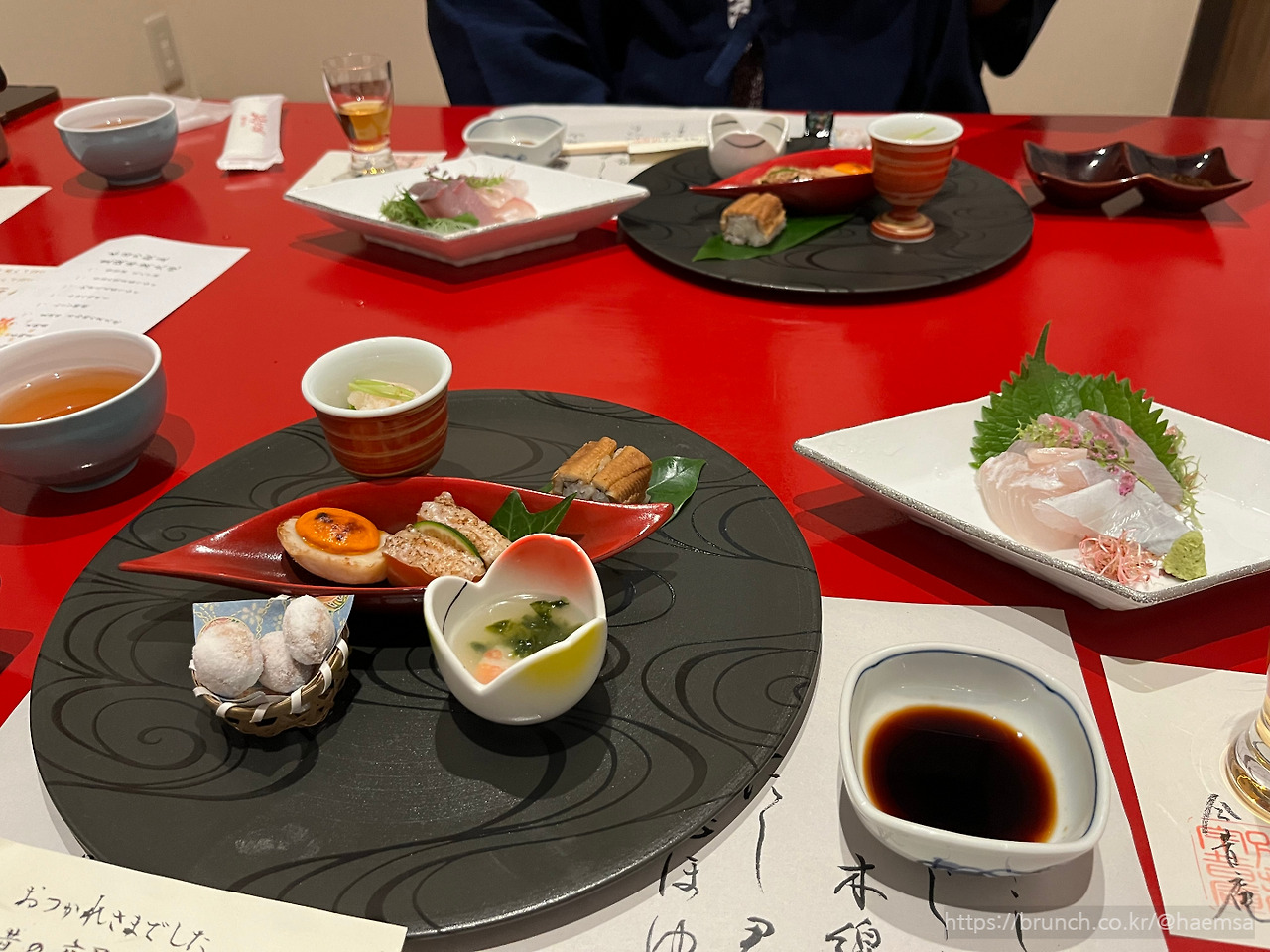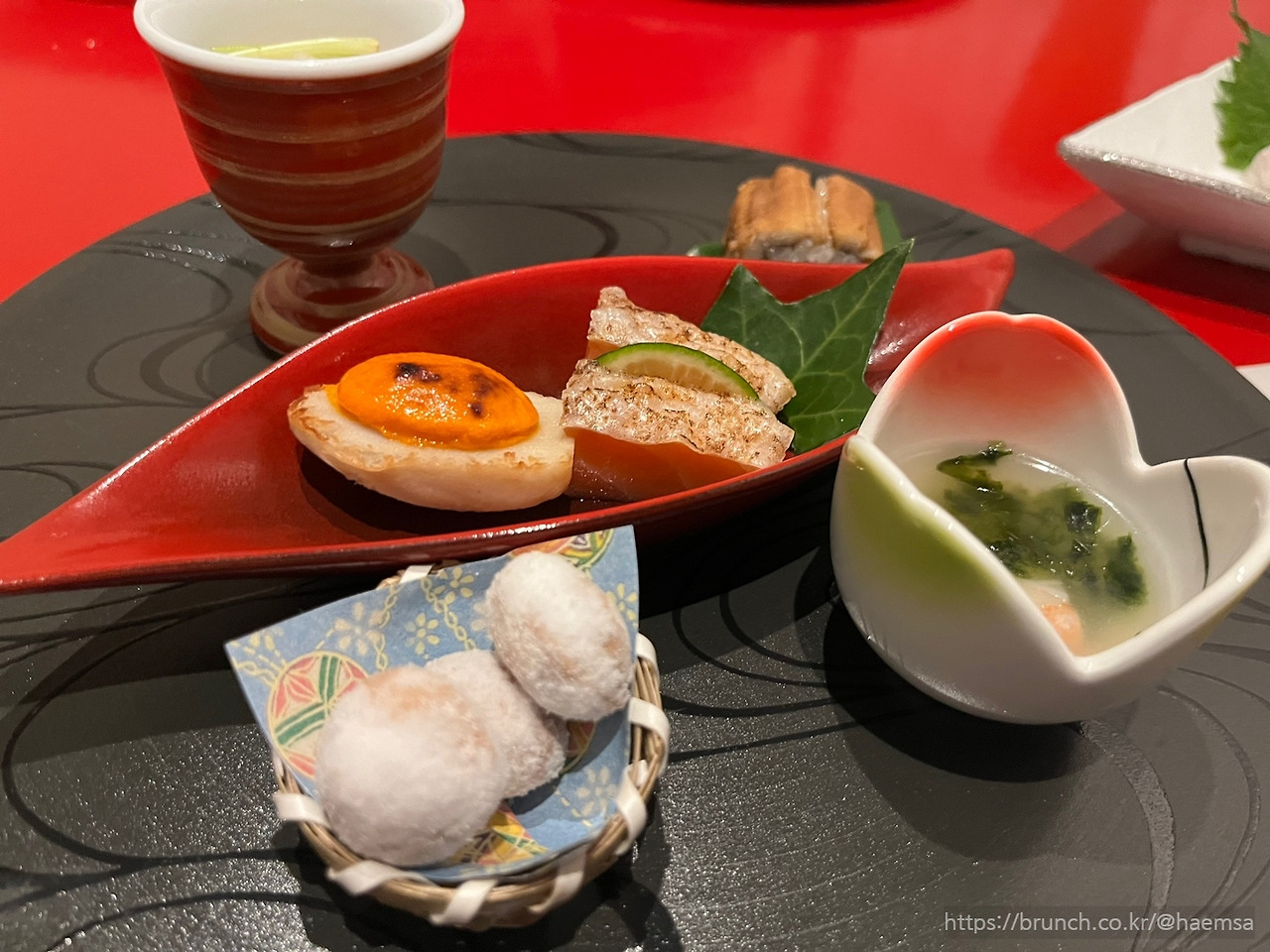 평소에도 다양한 요리를 조금씩 먹어보는 것을 좋아해서 인생 첫 가이세키에 대한 기대가 컸다. 식당에 도착하니 달큰한 식전 살구주부터 시작해 제철 재료를 사용한 전채와 계란찜, 사시미, 은어구이, 와사비 만두, 튀김까지 정갈하게 담긴 음식들이 차례차례 내어졌다. 메뉴 하나하나가 예쁘게 세팅되어 있어 듣던 대로 눈으로도 즐길 수 있는 요리구나, 생각했다.