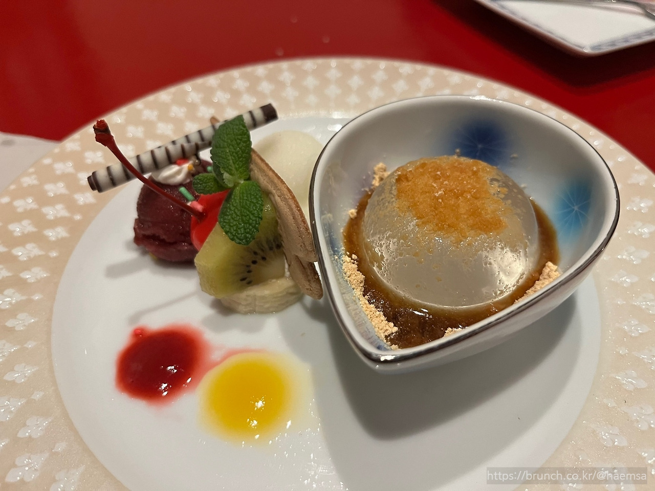 사실 처음에는 요리 하나하나의 양이 적어 보여서 방에 돌아가면 뭔가 더 먹어야겠거니 했는데, 마지막 메뉴인 셔벗과 젤리푸딩을 먹을 때 즈음엔 딱 기분 좋을 정도로 배가 불렀다. 가이세키는 그때그때 제철 재료들로 구성되기 때문에 이번에는 가을 은어가 나온 것 같았는데, 봄에는 또 얼마나 향긋한 요리들이 나올지 상상하는 것도 나름의 재미였다.