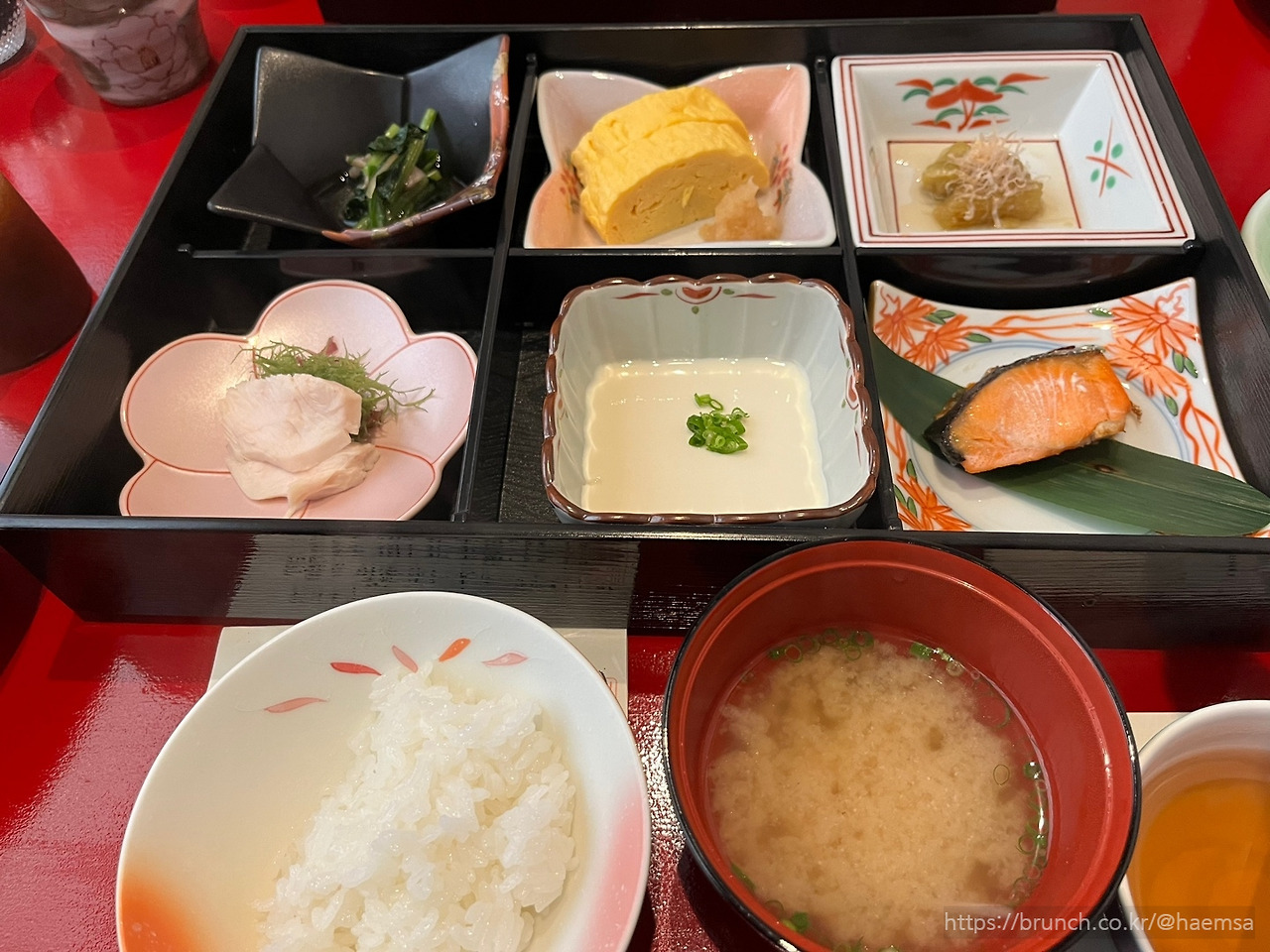 다음 날, 아침 일찍 일어나 긴린호수 물안개를 보러 나가겠다는 계획은 역시나 없던 일이 되었다. 전날 과식 과음의 여파로 컨디션이 아주 좋지 않았기 때문이었다. 그래도 조식은 간이 세지 않은 반찬 위주로 차려져 속이 한결 편했다. 계란말이, 연어구이, 오리고기와 나물 조금. 특히 따로 담아와 퍼주신 쌀밥이 아주 찰지고 맛있었다. 여행을 다니면 뭔가 재미있고 맛있는 걸 먹어야 할 것 같아서 소박한 밥상이 참 귀하다. 그래서 나는 지금도 이 아침식사가 자꾸 생각나는 것 같기도 하다.