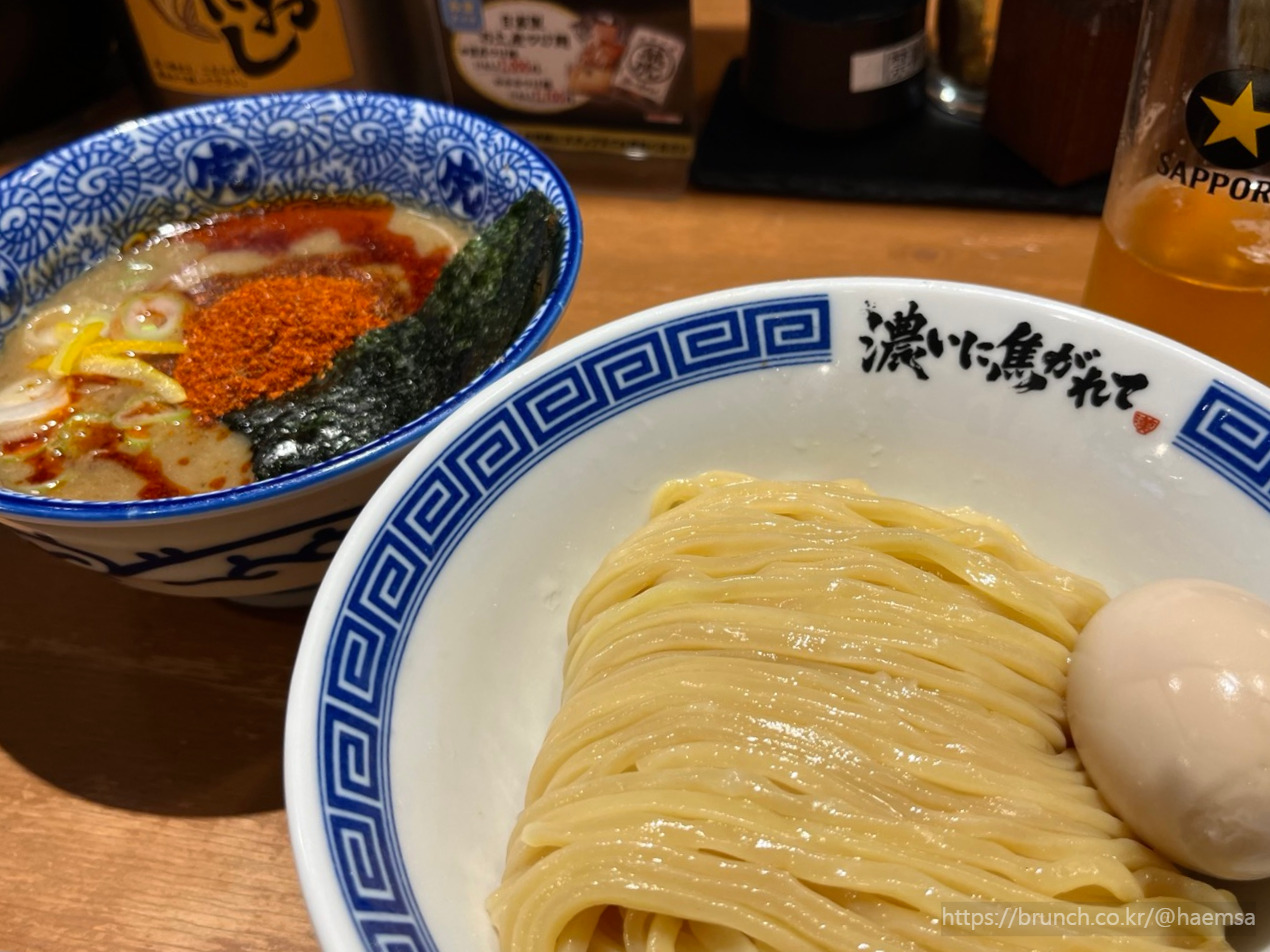 카네토라의 츠케멘은 순한맛과 매운맛이 있고, 매운맛을 선택하면 맵기 정도를 고를 수 있다. 나는 신라면 수준이라는 매운 츠케멘 3단계를 선택. 츠케멘은 삶은 면을 찍어 먹는 방식이라 국물 자체의 간이 센 편이다. 그래서 입맛에 따라 짜게 느껴질 수 있는데 그럴 땐 테이블에 비치된 가츠오다시를 부어 농도를 조절할 수 있다. 나는 자극적인 맛을 좋아하는 편이라 서빙된 그대로의 진한 국물에 촉촉한 면을 적셔 한 그릇을 뚝딱 해치웠다.