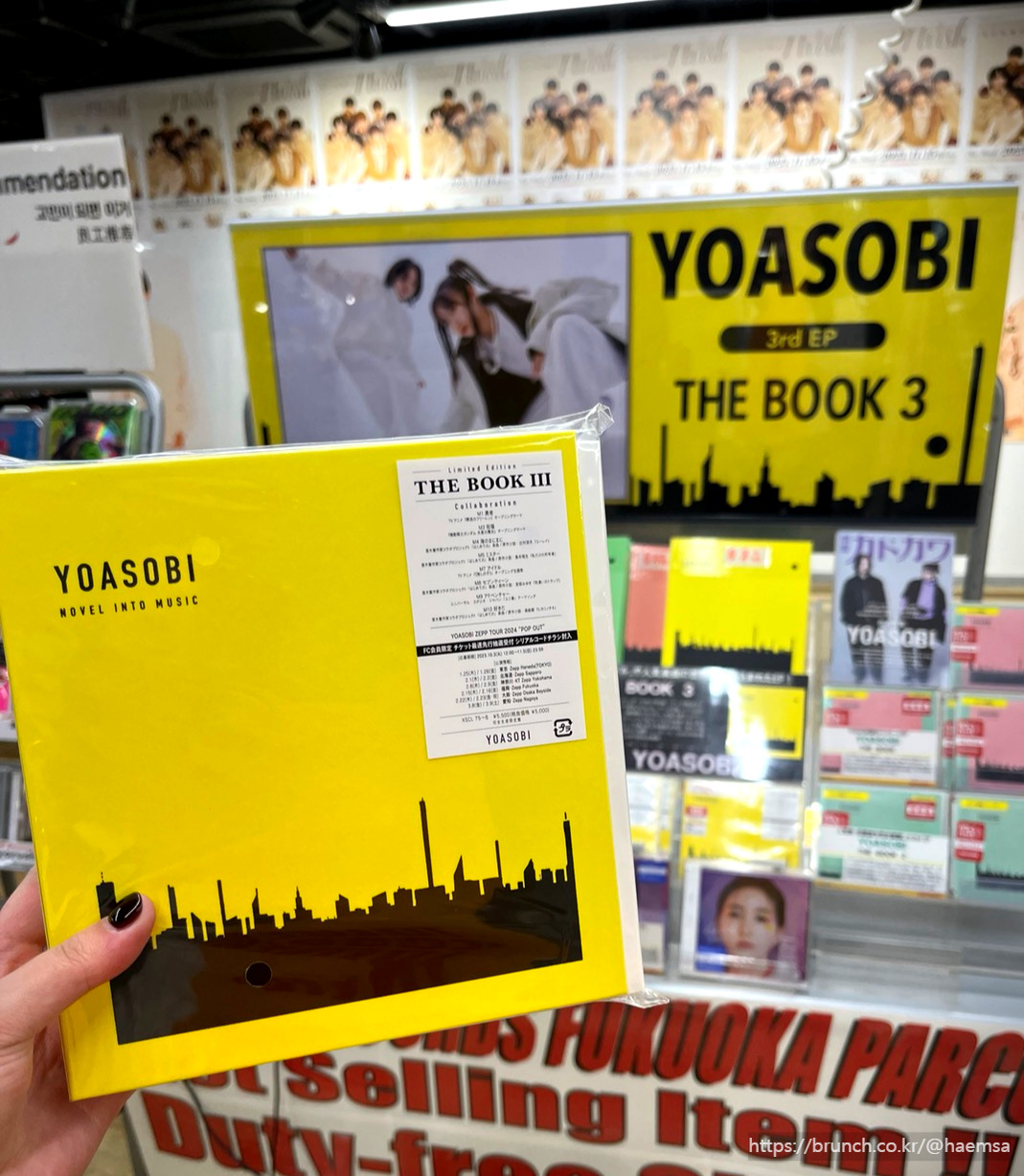 여행일 기준으로 한 달 뒤, 요아소비 내한공연이 예정되어 있었다. 곰손인 나는 티켓팅에 장렬히 실패했기 때문에 아쉬운 대로 요아소비 신보를 집어 들었다. 각 수록곡을 이미지화한 일러스트와 가사들을 앨범명 그대로 한 권의 책처럼 구성한 한정판. 한국에서는 8만 원이 조금 안 되는 가격이었는데 후쿠오카에서는 5천 엔대에 살 수 있었다. 그즈음 가장 자주 듣던 세 곡이 모두 포함되어 있었던 점도 좋았고, 곡에 따라 속지의 재질이나 레이아웃에 변화를 주는 디자인 디테일까지 마음에 꼭 드는 앨범이었다.