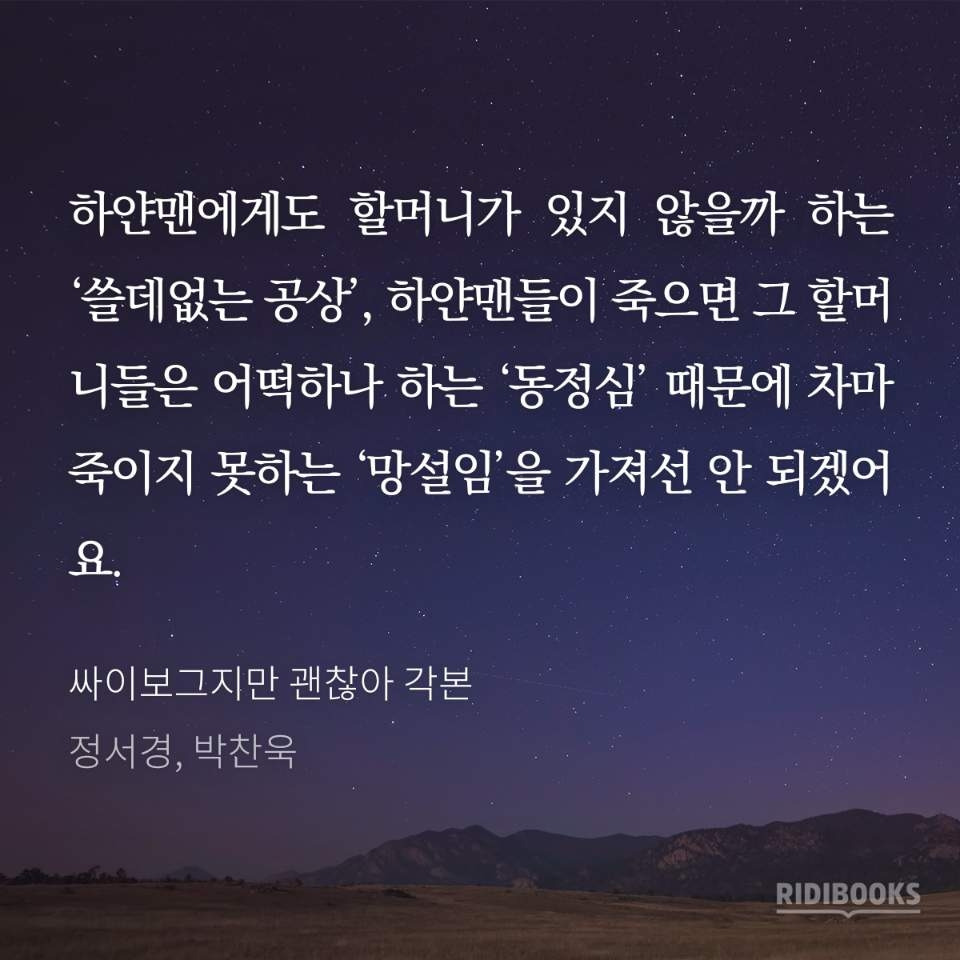살면서 이렇게 화나는 일이 몰려온적이 있었나 싶을 정도로 평정심을 잡기가 어렵다. 응당 화내야 할 일들인데 물러터진 마음이 '그래도 내가 잘했어야지' 하고 자꾸 스스로를 괴롭힌다. 나를 지키지 못하는 물러터진 마음 따위에 휘말리지 말아야 할텐데. 이런 상황에 어울리는 대사를 담은 대본집을 읽고 위안을 얻는다. 비슷한 마음을 일찍이 글로 영화로 만들어준 사람들이 있었기에 그나마의 평화를 찾을 수 있다.